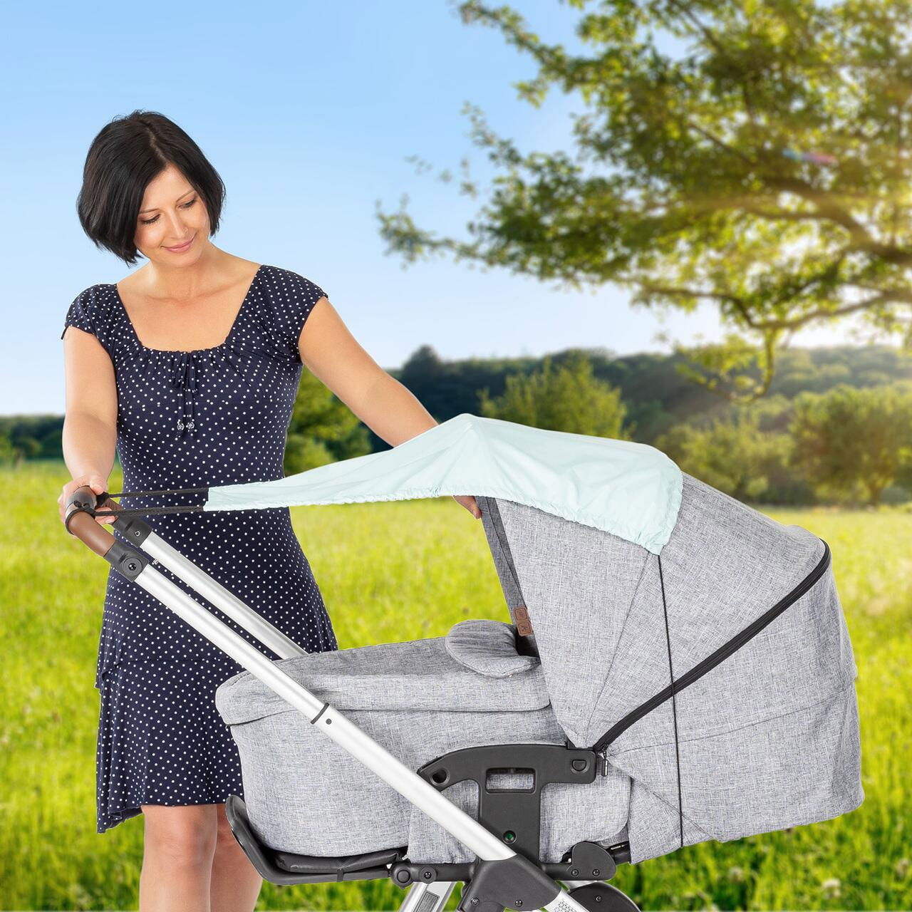 Pielea tanara si fina a bebelusului tau nu a dezvoltat inca nicio protectie proprie impotriva razelor UV. Doar cateva minute neprotejate la soare sunt suficiente pentru a-i arde pielea. O arsura solara nu este doar foarte neplacuta si dureroasa pentru bebelusul tau, dar creste si riscul de boli de piele ulterioare. Din acest motiv, pielea are nevoie de protectie suplimentara. Copertina de soare pentru carucior, compatibila si cu alte sisteme de calatorie, ofera umbra placuta copilului tau si protejeaza impotriva radiatiilor UV daunatoare.