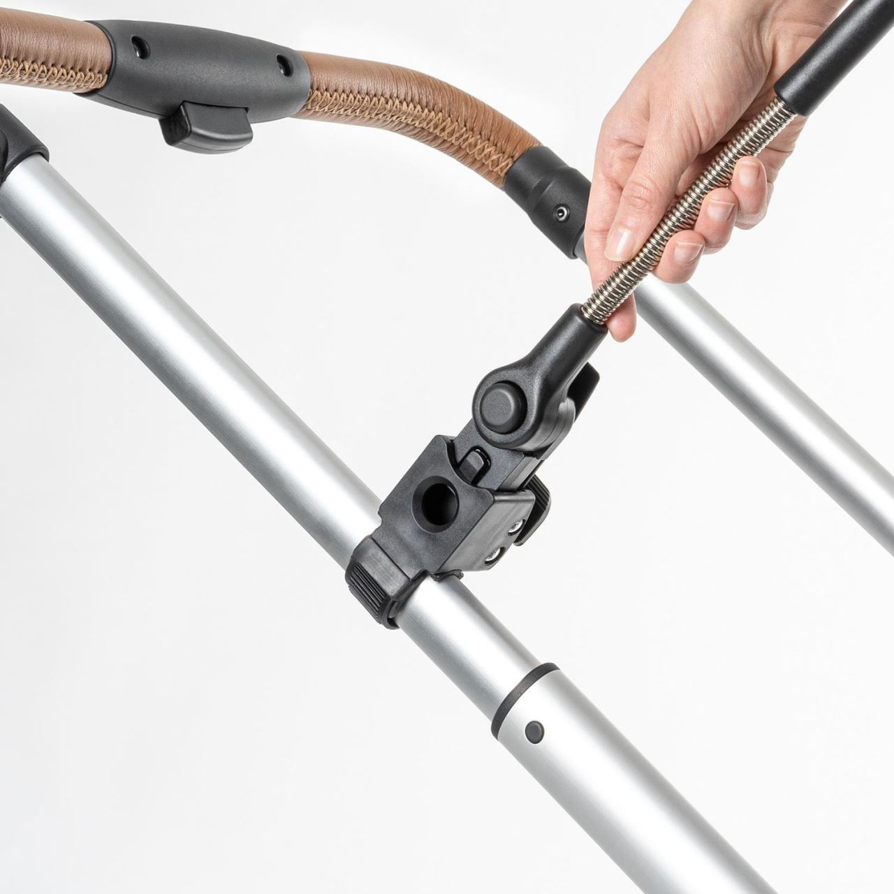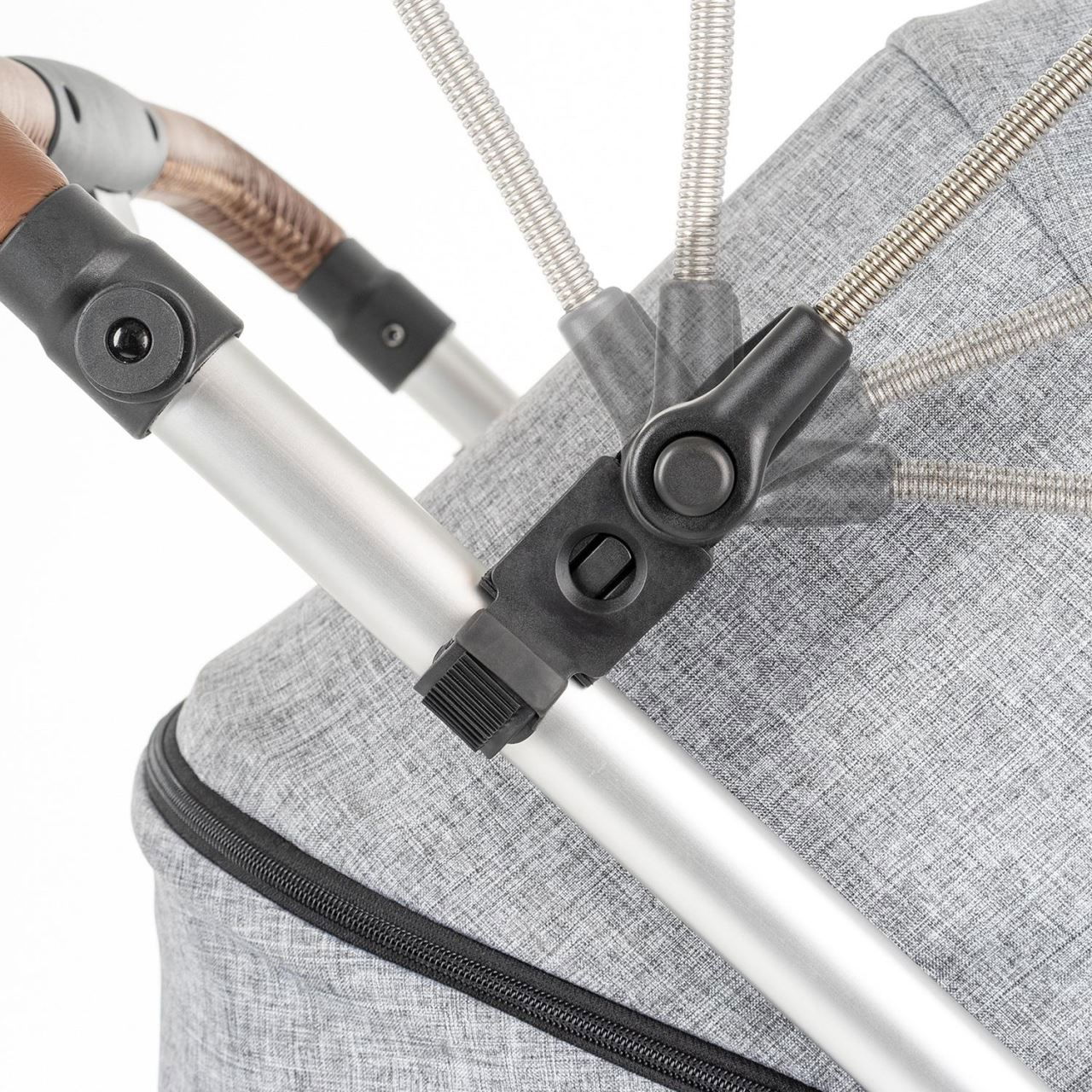 Suportul universal se adapteaza individual la latimea cadrului fiecarui carucior. Poate fi montat in siguranta atat pe barele rotunde, cat si pe cele ovale. Poti atasa umbrela de soare la aproape orice model de carucior, unde iti doresti: pe glisor, pe bara de protectie sau direct pe cadrul caruciorului. Suportul cauciucat previne alunecarea umbrelei si ofera o prindere sigura chiar si in conditii de vant sau pe teren accidentat. In plus, nu zgarie cadrul caruciorului.