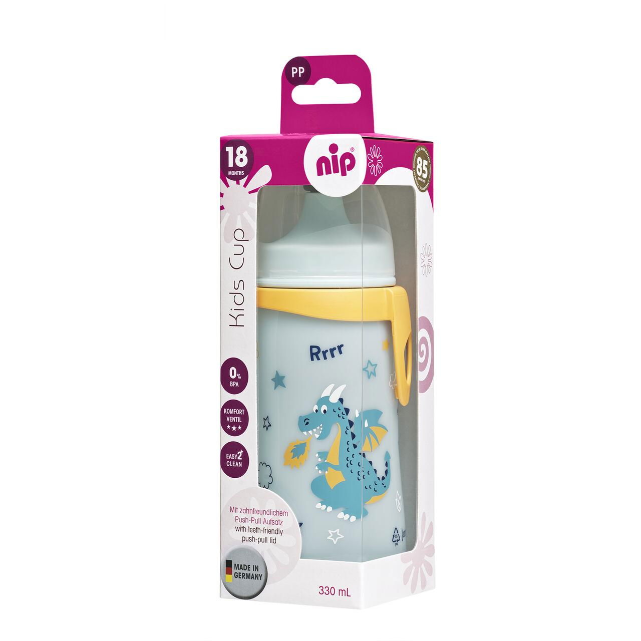 Cana Kids Cup de la nip® este confectionata din plastic polipropilena PP, necasant si de inalta calitate, si este prevazuta cu o clema pentru a putea fi atasata de haine sau geanta. Este potrivita pentru bebelusi de la 18 luni, are forma ergonomica de clepsidra si este usoara, lucru care o face usor de apucat si de tinut. Capacul cu filet si adaptorul de baut se potrivesc la toate canile de baut nip®.