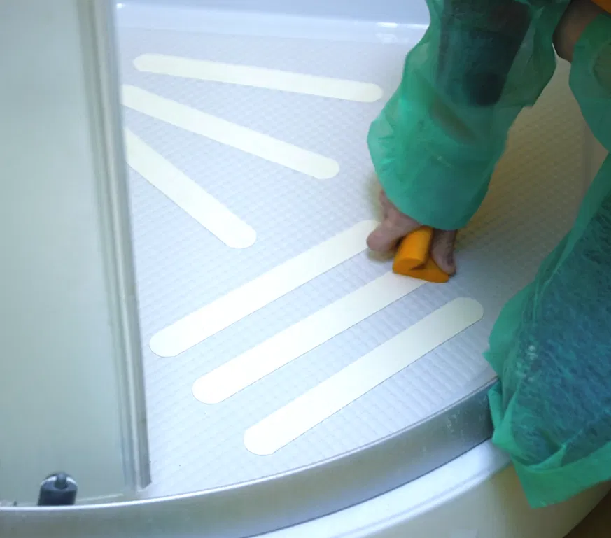 Banda autoadeziva se poate lipi pe gresie sau in cada, cabina de dus, piscine, fiind cea mai eficienta solutie antiderapare de uz casnic.