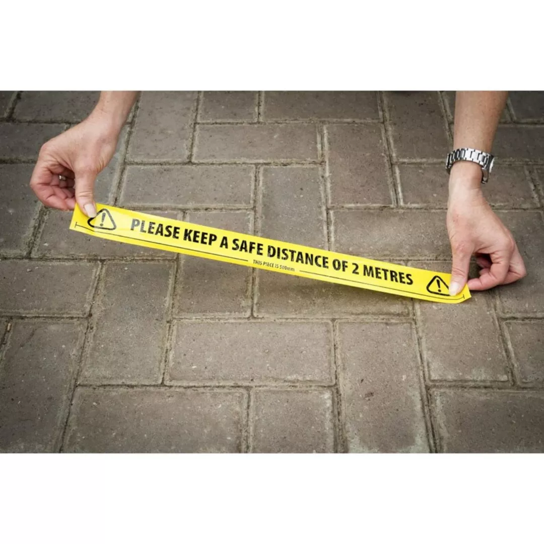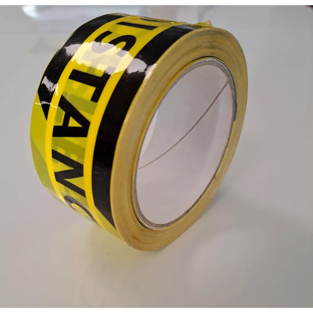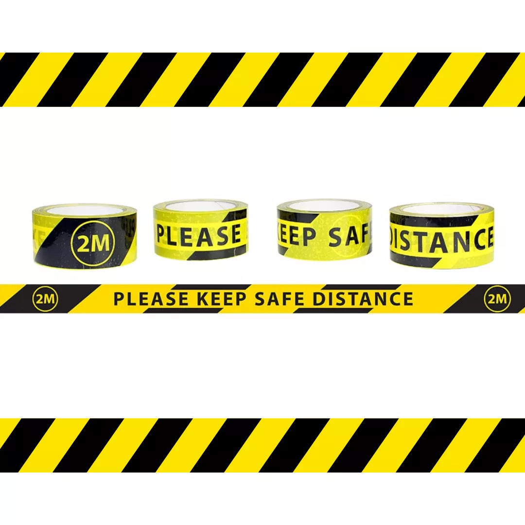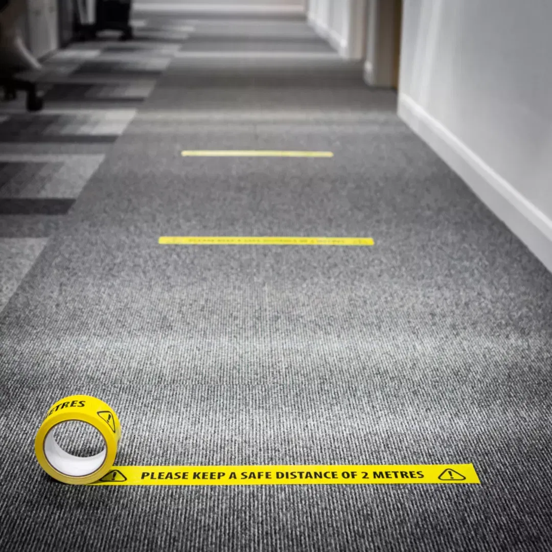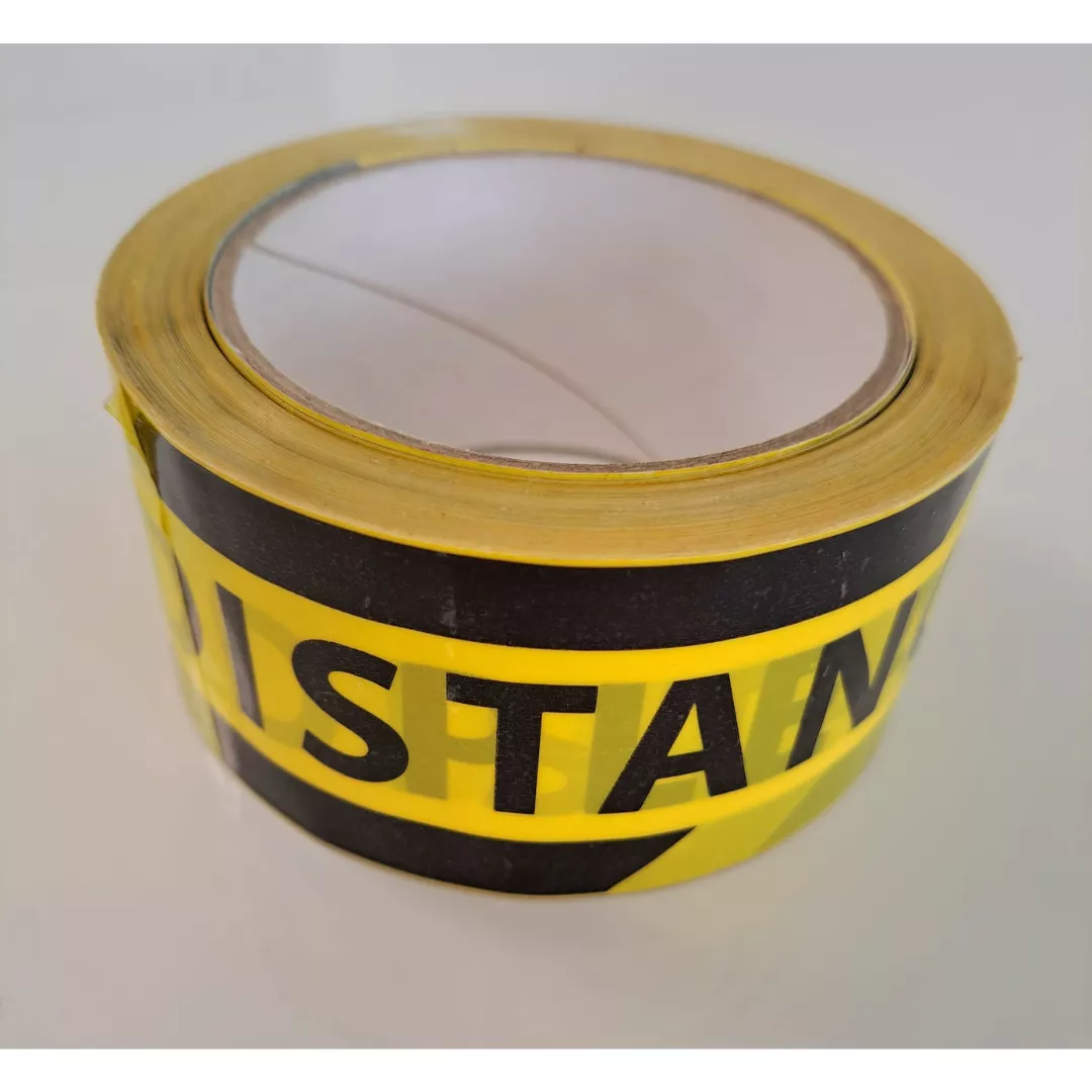 Banda de marcare - distantare sociala, laminata, adeziva, are un strat de suprafata superior care protejeaza culoarea vibranta si imprimeul.