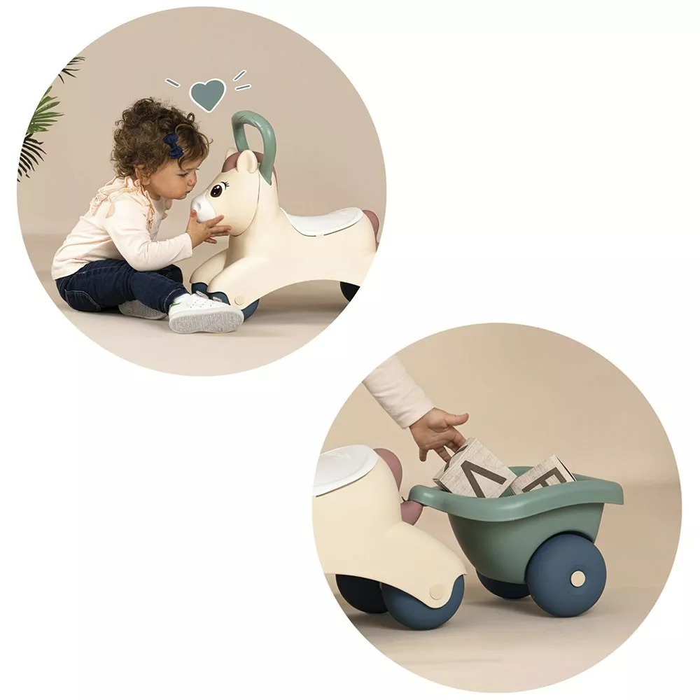 Masinuta de impins cu o remorca mica, ii va permite copilului sa transporte diverse obiecte mici.