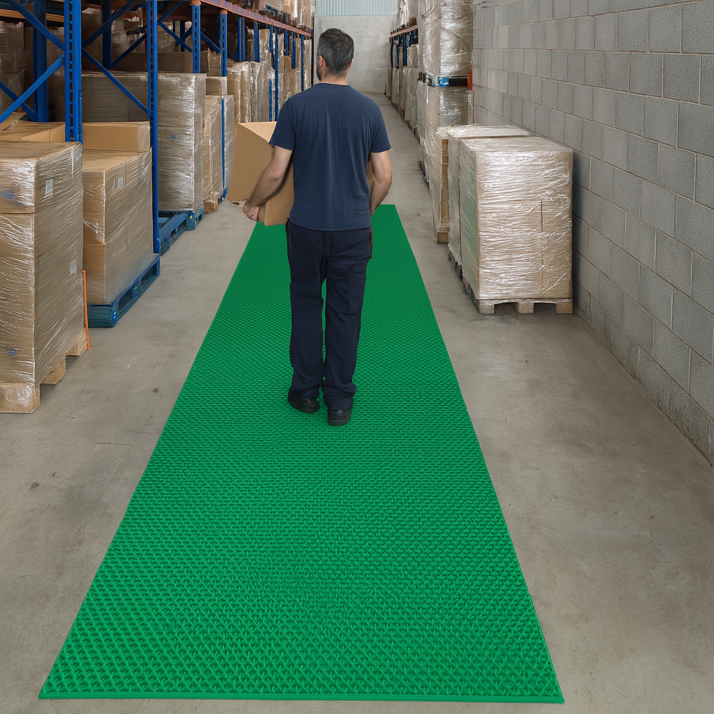 Ele acționează ca un strat de protecție și confort, reducând riscul de alunecare și oboseala angajaților care stau mult timp în picioare.