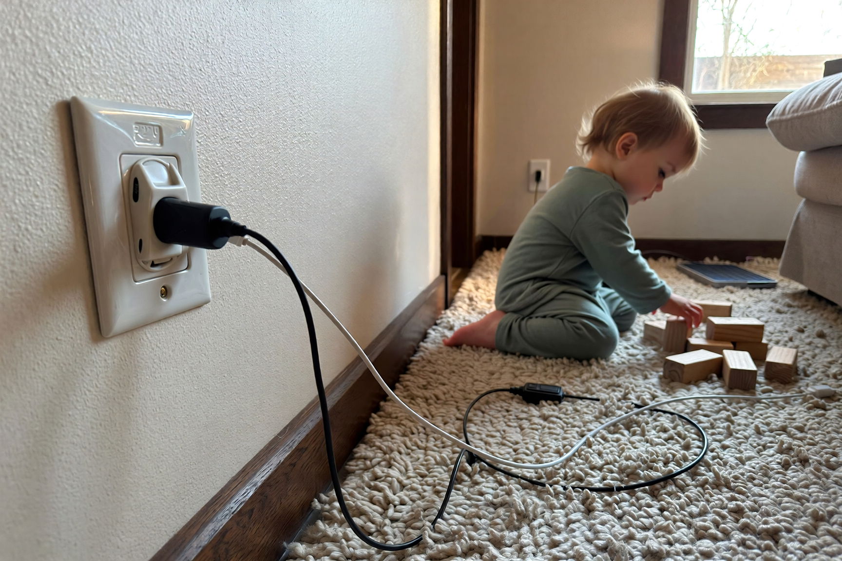 👉 Soluție: protecții pentru prize și cutii pentru organizarea cablurilor, care limitează accesul copilului și reduc riscul de electrocutare sau smulgere.