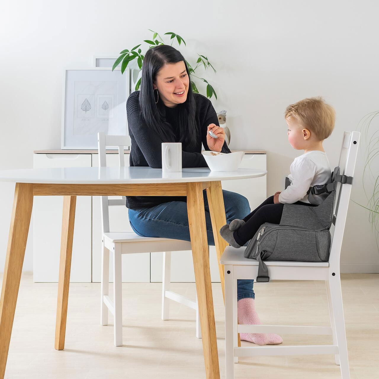 Inaltatorul de scaun se prinde de scaun cu curelele stabile, reglabile, cu cleme de fixare. Curelele permit folosirea si ca geanta de umar De asemenea, copilul este asigurat cu o centura de siguranta in 3 puncte. Produsul respecta standardul de siguranta EN16120 pentru scaune si inaltatoare de masa pentru copii.