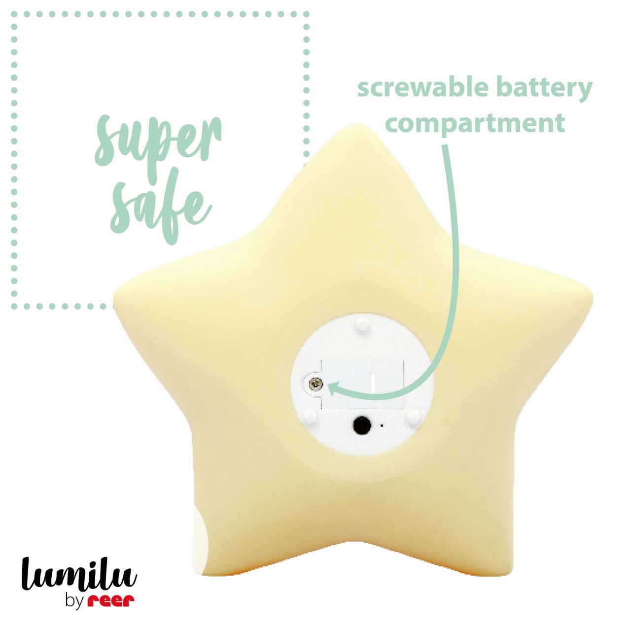 Deosebit de sigura pentru copii datorita compartimentului pentru baterii, cu insurubare. Astfel, copilul nu poate ajunge la baterie. In plus, designul fara margini si materialul nontoxic - fara BPA si ftalati - fac din aceasta lampa de veghe un companion sigur pentru micutii nostri. Utilizarea este cu atat mai sigura si datorita luminilor LED. Lampa de veghe ofera siguranta prin utilizarea tehnologiei moderne LED. Datorita degajarii scazute de caldura, nu exista riscul de aprindere nici macar in cazul utilizarii pe termen lung. In acelasi timp, aceste lumini creeaza o atmosfera placuta, linistitoare si calda.