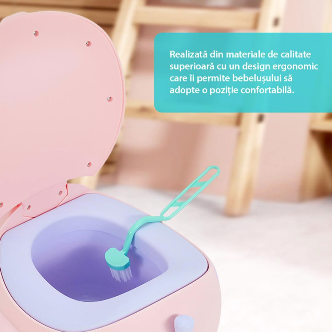 Pachetul contine: periuta de wc, colac conturat pentru comfortul copilului si picioruse ce ofera echilibru si stabilitate.