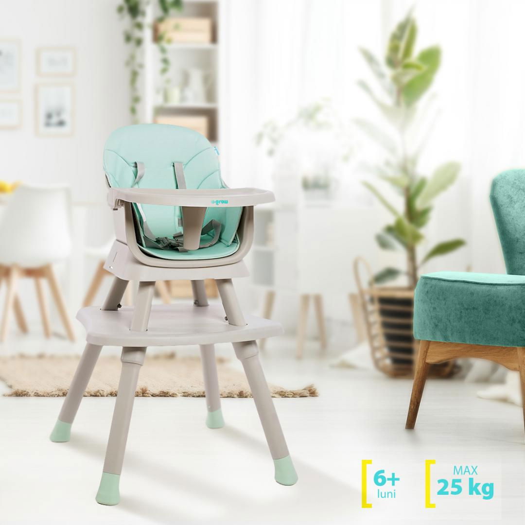 Este un scaun inalt transformabil care combina stilul unic scandinav cu functionalitatea. Datorita designului sau simplu acesta poate fi adaptat rapid la nevoile copilului. Cu doar cateva miscari se transforma dintr-un scaun inalt intr-un scaun + set de masa. Este fabricat din materiale de inalta calitate ceea ce il face durabil si sigur. Are centuri in cinci puncte ce impiedica alunecarea copilului. Scaunul este captusit cu o tapiterie moale si usor de curatat.