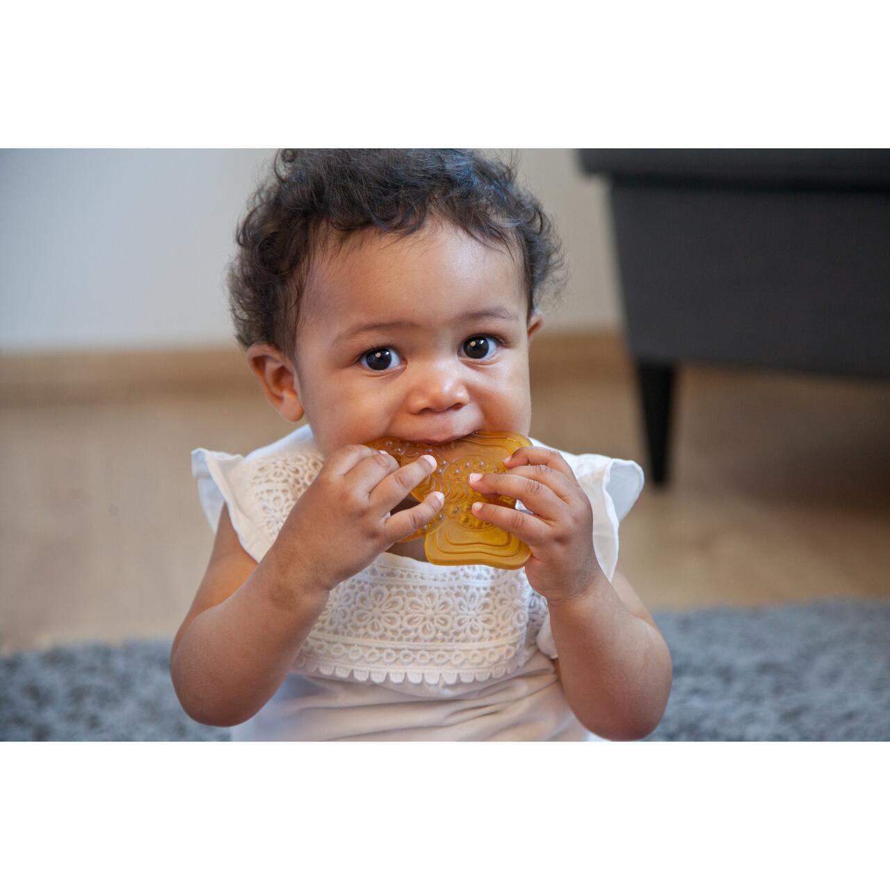 Acest inel de dentitie organic este foarte prietenos cu bebelusii, fiind ideal pentru a sustine procesul de dentitie. Suprafata sa texturata maseaza usor gingiile, iar forma ergonomica si greutatea