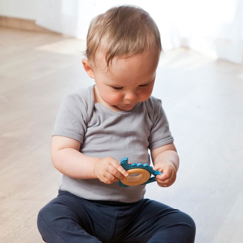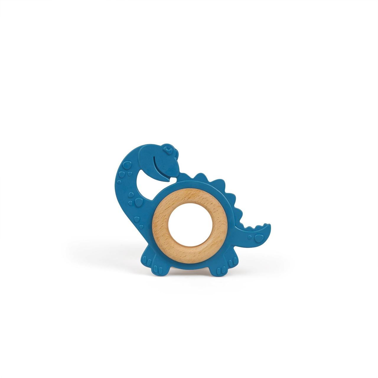 Jucaria pentru bebelusi in forma de dinozaur, din cauciuc natural si lemn, este destinata jocului si rosului. Partea externa din cauciuc organic le este de ajutor bebelusilor pentru a sustine procesul de dentitie. Datorita suprafetei sale structurate si a structurii moi, maseaza usor gingiile bebelusului in timp ce o mesteca.