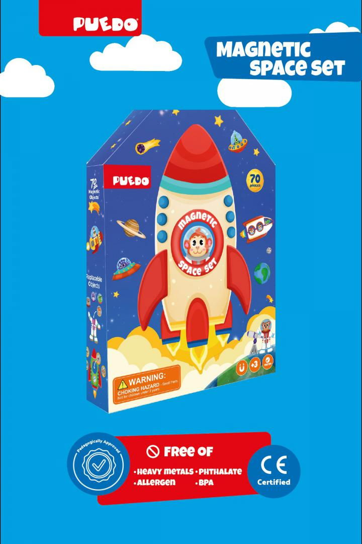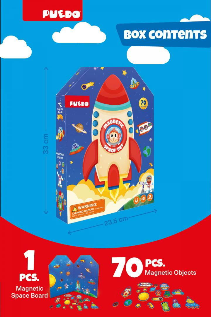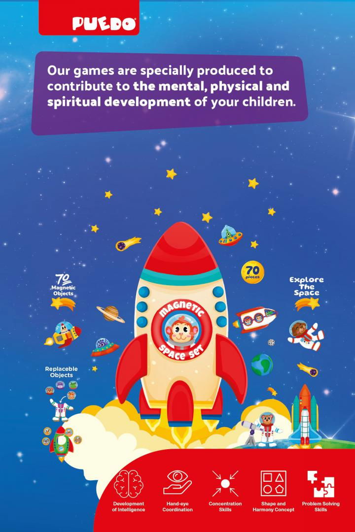 Acesta este un joc magnetic cu spațiul cosmic sub forma unei cărți magnetice, special concepute din material EVA și 70 de obiecte spațiale magnetice diferite. n