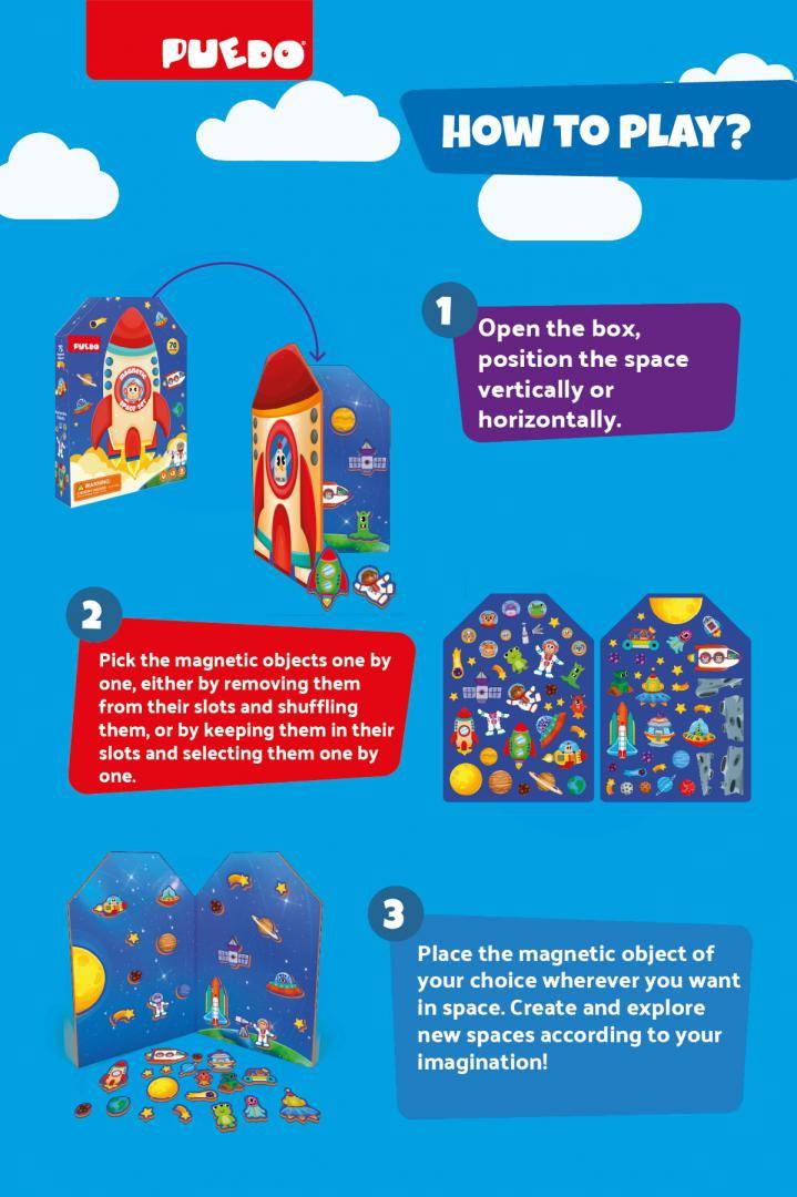 CUM SE JOCĂ: Pe cartea magnetica sunt amplasate diverse obiecte spațiale, OZN-uri, rachete, stele, planete, meteori; Asezati si mutati obiectele spațialeastfel incat sa creati diferite concepte în funcție de imaginație.