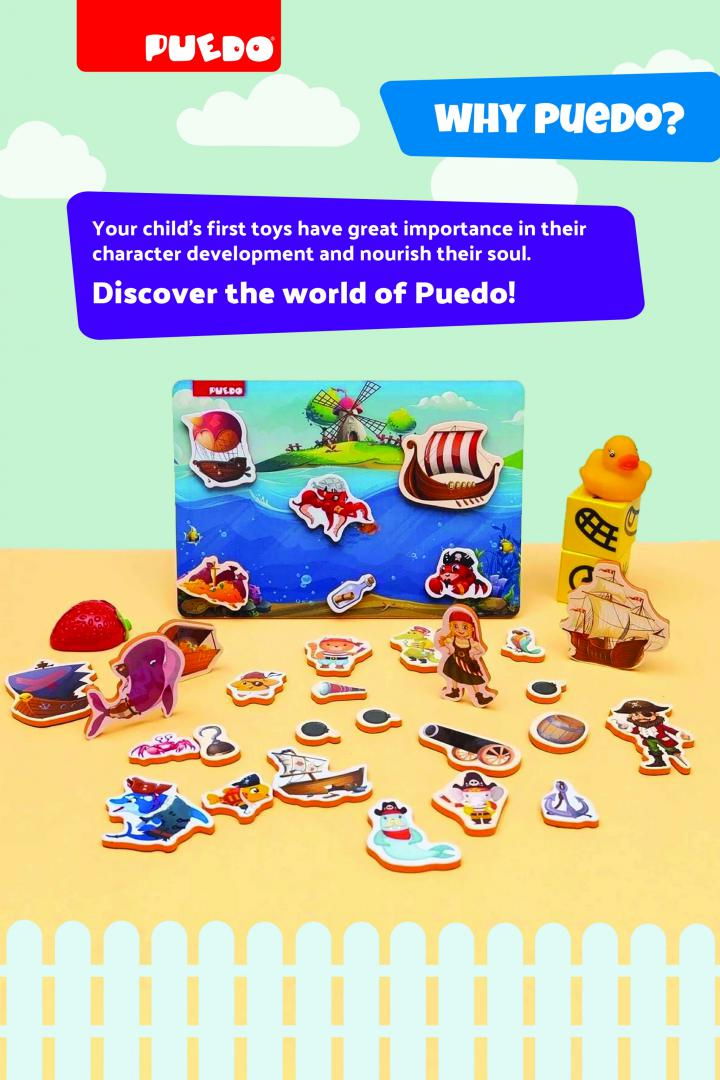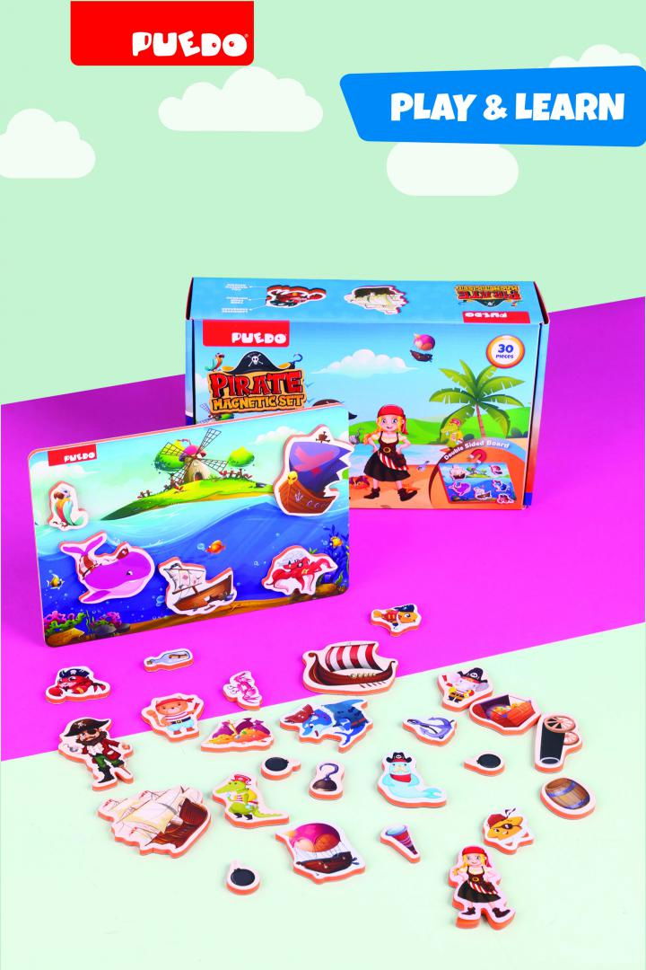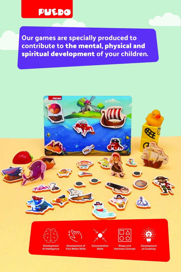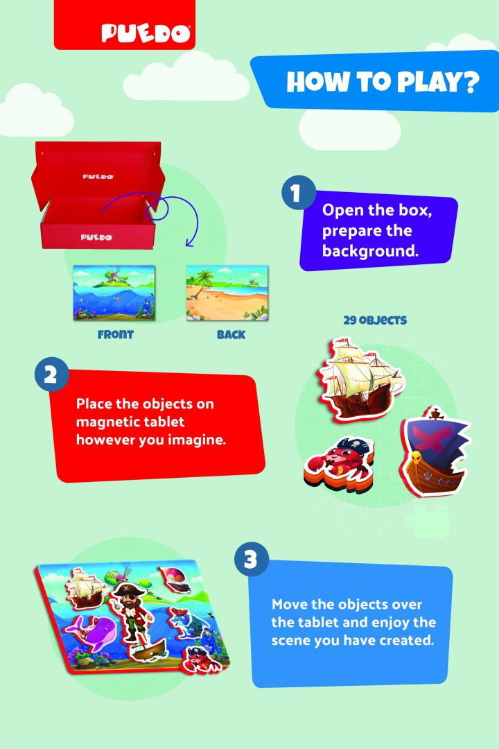 Copiii pot crea un univers nou cu aceste 30 de piese diferite bazate pe conceptul marin sau cel de insula,folosindu-si imaginatia. Ei pot crea povesti originale, mutand piesele cu imagini diferite pe cele doua planse. Suprafata magnetica a plansei ajuta la dezvoltarea abilitatilor manuale ale copilului si o face perfecta pentru calatoriile lungi, in masina sau tren. Plansa poate fi utilizata cu usurinta pe suprafete de metal, cum ar fi frigiderul.