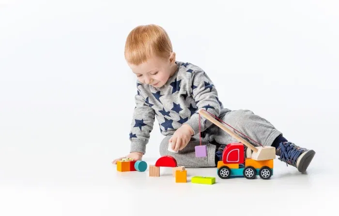 Macara magnetică din lemn Cubika, 2 în 1 – set de construcție și masinuta educativă, ideal pentru copii 3 ani+, vopseluri sigure și margini rotunjite.
