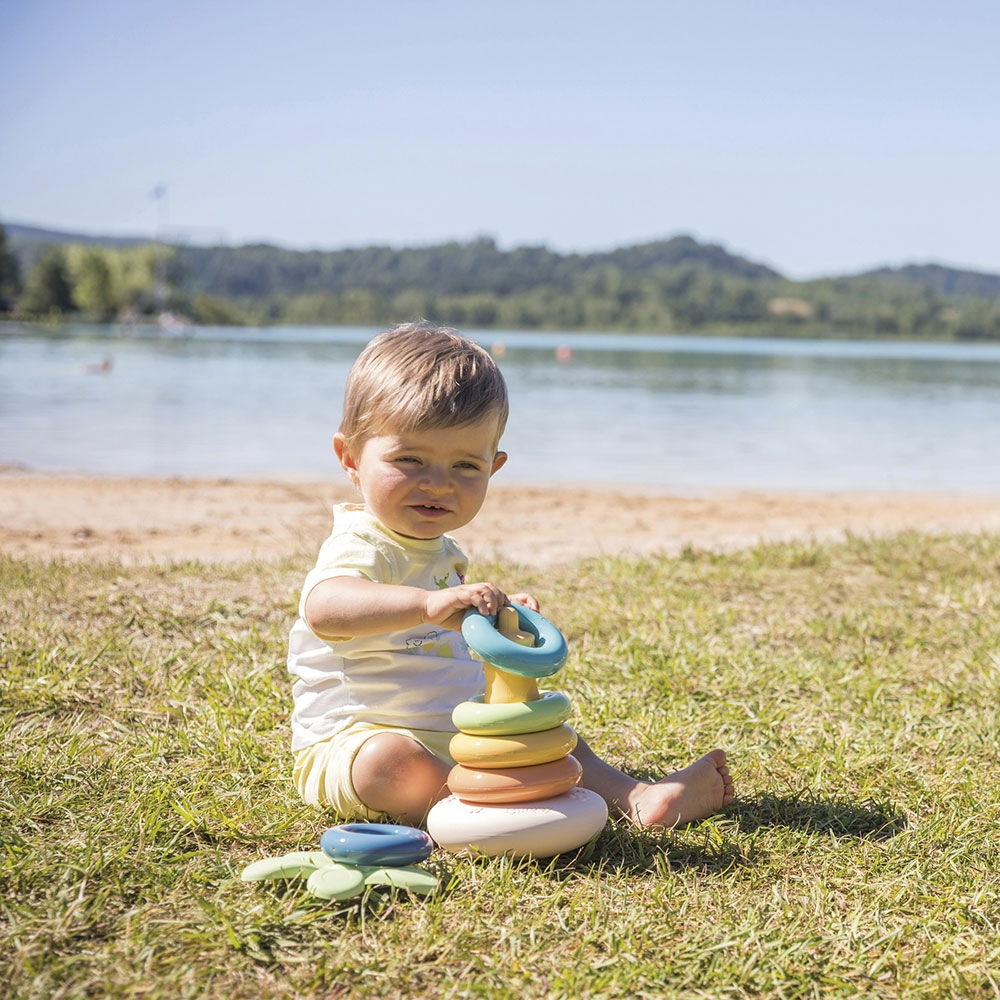 • Copilul tau se poate distra stivuind cele 5 inele colorate pentru a forma o piramida