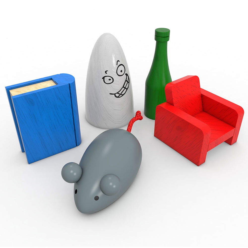 - Continutul cutiei: 5 pioni (fantoma, carte, fotoliu, pahar, soarece), 60 de carti (fotografii)