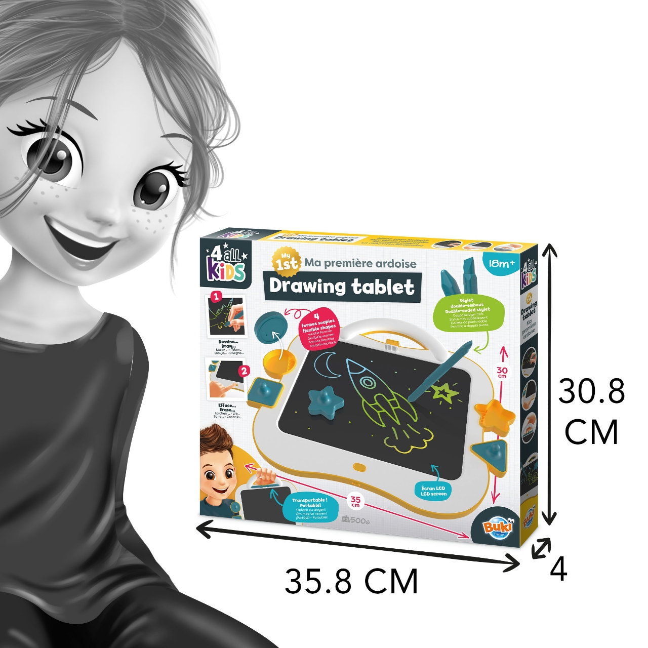 O tableta LCD pentru copii mici, cu 4 forme din silicon. Scrieti, desenati si stampilati iar si iar fara a va murdari. Apasati butonul de stergere si incepeti din nou. Stylus-ul ergonomic este utilizat ca un stilou si are doua varfuri: unul fin si unul lat. Tableta poate fi blocata pentru a preveni stergerea desenului. Tableta cantareste doar 500 g si este usor de transportat. Ecran multicolor. Continut: 1 tableta, 1 stylus, cu doua varfuri, 4 forme din silicon. Dimensiunile cutiei: 35.80 x 04.00 x 30.80 cm Varsta recomandata: 18 luni+ Baterii: Necesita 2 baterii LR03, neincluse. Atentie: Fisa cu instructiuni trebuie pastrata, deoarece contine informatii importante. PASTRATI AMBALAJUL PENTRU CONSULTATII ULTERIOARE. Culorile si continutul pot varia usor. Necesita 2 baterii LR03-AAA (neincluse). Bateriile trebuie schimbate de catre un adult. Bateriile sunt clasificate drept DEEE si trebuie eliminate in siguranta atunci cand nu mai sunt necesare.