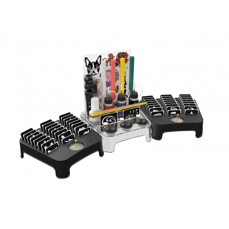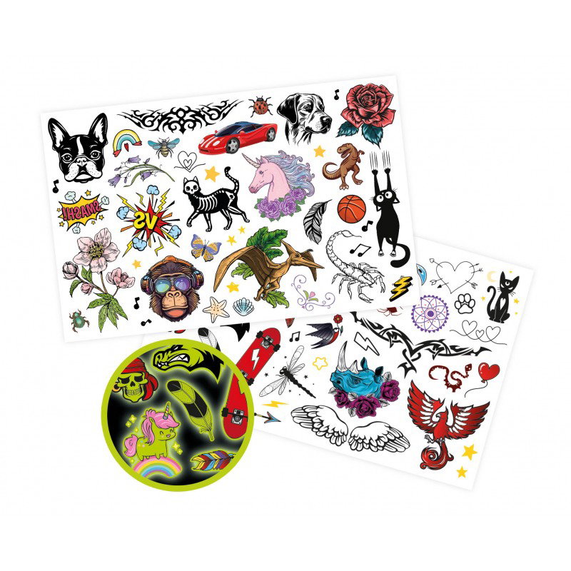 Deveniti un adevarat artist cu propriul dvs. studio de tatuaje. Alegeti un sablon, asezati-l pe piele si aplicati cerneala folosind stiloul pentru stampila. Asezati stiloul pentru tatuaj in instrumentul furnizat pentru a desena cu mana libera sau colorati sabloanele ca un adevarat artist tatuator. De asemenea, puteti aplica sclipici pentru a face tatuajul sa straluceasca. Sunt incluse si 4 foi de tatuaje temporare pentru tatuaje colorate, care stralucesc in intuneric. Cerneala, pixul si tatuajele temporare pot fi indepartate dupa cateva zile prin spalare sau folosind demachiant, in functie de tatuaj si tip de piele. Dimensiunile cutiei: 33.00 x 08.00 x 25.00 cm Varsta recomandata: 7 ani+ Contine: 4 stilouri pentru tatuaje, 3 cerneluri pentru tatuaje, 4 foi de tatuaje temporare, 2 recipiente cu sclipici, 1 flacon de adeziv cosmetic si 50 de sabloane autoadezive si instructiuni cu ilustratii color. Avertisment: Numai pentru copii cu varsta de 7 ani sau mai mari AVERTIZARE! Nu este potrivit pentru copiii mai mici de 3 ani din cauza pieselor mici care pot fi ingerate. Pericol de sufocare. AVERTIZARE! Nu aplicati in jurul ochilor. AVERTISMENT PENTRU PERSOANELE CU PIELE SENSIBILA: Daca observati orice roseata sau reactie a pielii de orice fel, indepartati imediat tatuajul. PASTRATI AMBALAJUL PENTRU REFERINTE VIITOARE. Culorile si continutul pot varia usor.