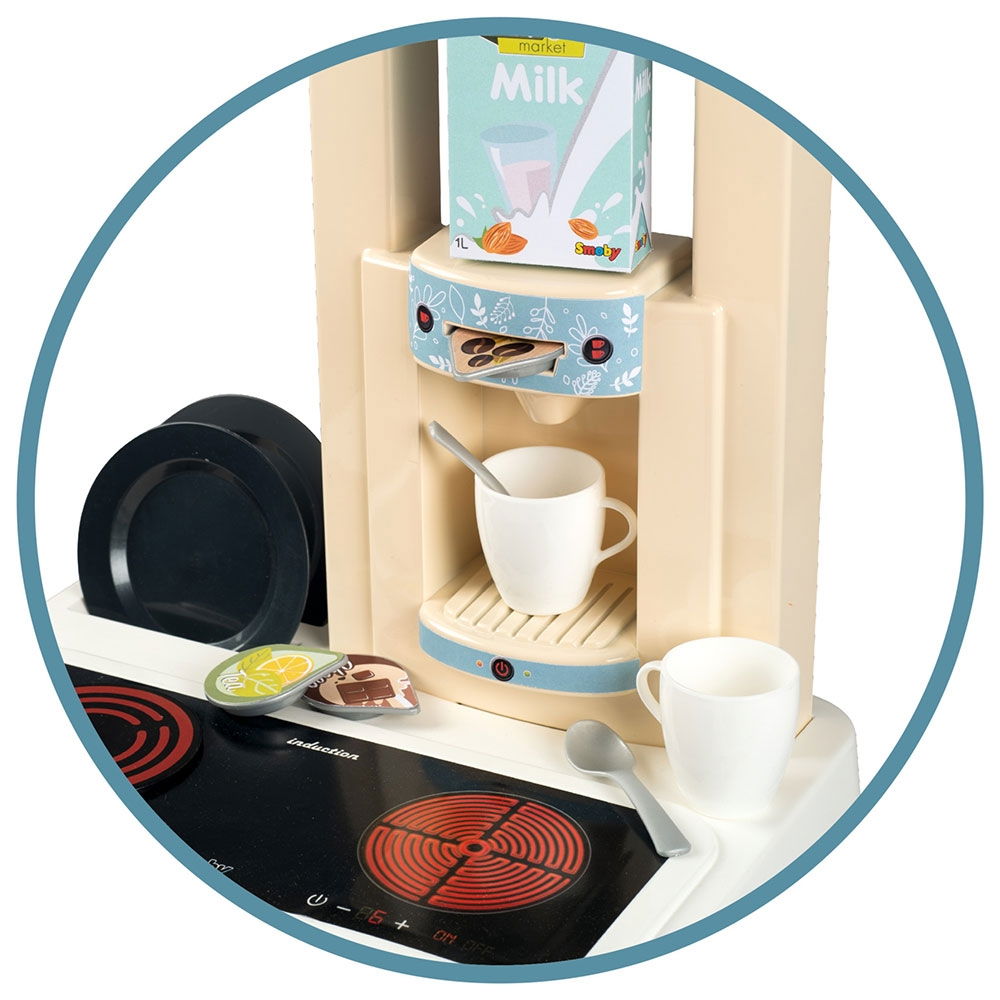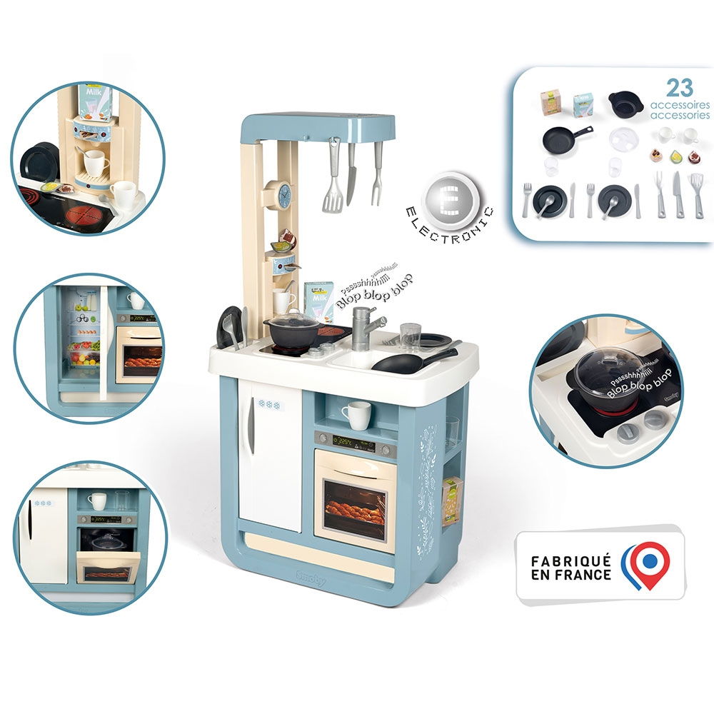 - Bucataria Smoby este dotata cu 23 de accesorii interesante. Printre aceste accesorii se regasesc: frigider la care se deschide usa, cuptor la care se deschide usa, plita (cu sunet specific 'Blop-Blop'), chiuveta, expresor de cafea cu pastile, oala, tigaie, si alte accesorii