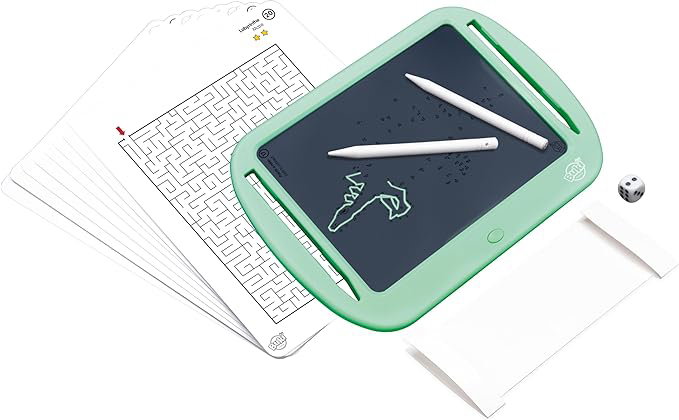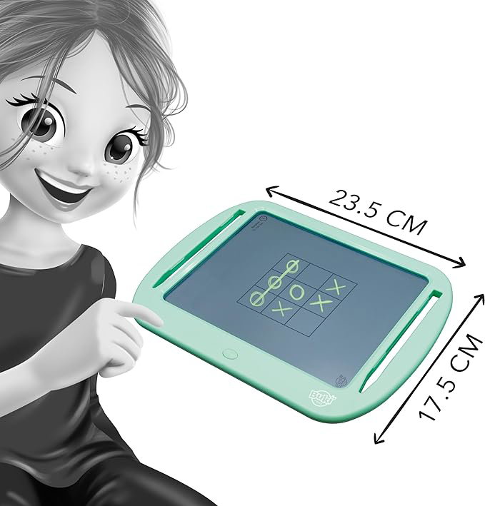 Aceasta tableta cu jocuri este ideala pentru a o lua in vacanta! Are ecran transparent, este usoara (150 gr) si are dimensiunea: 23,5 x 17,5 cm. Copiii se pot juca 20 de jocuri de societate singuri sau in pereche. Printre jocurile cele mai cunoscute sunt: Sudoku, Tic-Tac-Toe (X si O), Spanzuratoarea, etc.. Tableta are inclusa 2 pixuri cu care copiii pot scrie sau desena direct pe ecran. In spatele tabletei este un buton cu care se poate bloca ecranul astfel incat nimic sa nu fie sters. Functioneaza cu 1 baterie CR2025 care este inclusa in pachet. Continut cutie: o tableta, 1 zar, 2 pixuri, separator de ecran din hartie, 10 planse cu doua fete pentru cele 20 de jocuri. Varsta recomandata: 6 ani+ Dimensiuni cutie 24.00 x 01.50 x 17.80 cm AVERTIZARE! Nu este potrivit pentru copiii sub 36 de luni din cauza pieselor mici care pot fi ingerate. Pericol de sufocare. AVERTIZARE! A se utiliza sub supravegherea directa a unui adult. Prezenta punctelor si marginilor ascutite functionale. PASTRATI PACHETUL PENTRU REFERINTE VIITOARE. Culorile si continutul pot varia usor. ATENTIE! Bateria se inlocuieste numai de catre adulti, asezandu-se in spatiul destinat, in pozitia corecta, respectandu-se polaritatea. Compartimentul bateriilor trebuie sa fie curat. Bateriile folosite se schimba si se recicleaza conform normelor in vigoare. In cazul neutilizarii produsului pentru mai mult timp, se scot bateriile pana in momentul refolosirii.