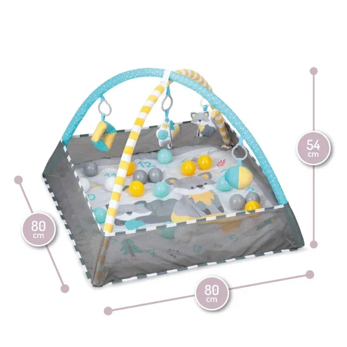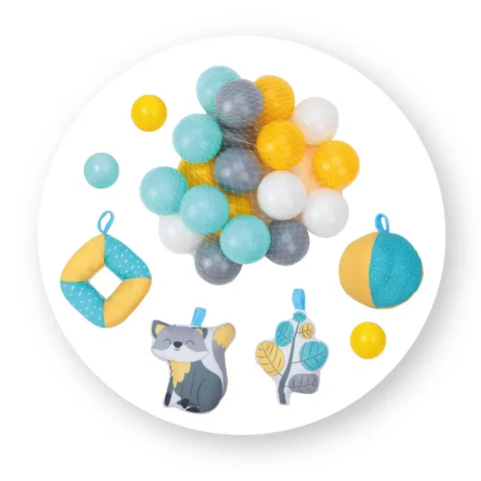 Funcția de tarc este asigurată de pereții laterali moi din material textil, care delimitează zona de joacă și îi oferă bebelușului un spațiu sigur în care să exploreze. Bariera din plasă împiedică ieșirea accidentală și adaugă un plus de siguranță. Setul include și 18 bile în culori pastelate, perfecte pentru joaca senzorială, dar și pentru transformarea centrului într-o piscină cu bile.