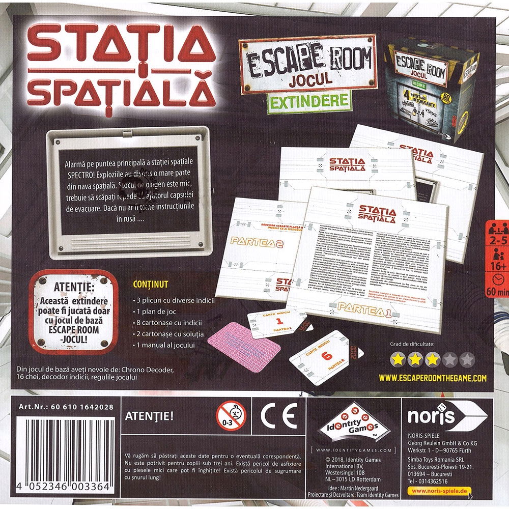 - Extindere joc Noris Escape Room cu aventura Statia Spatiala este recomandat copiilor cu varsta de peste 16 ani