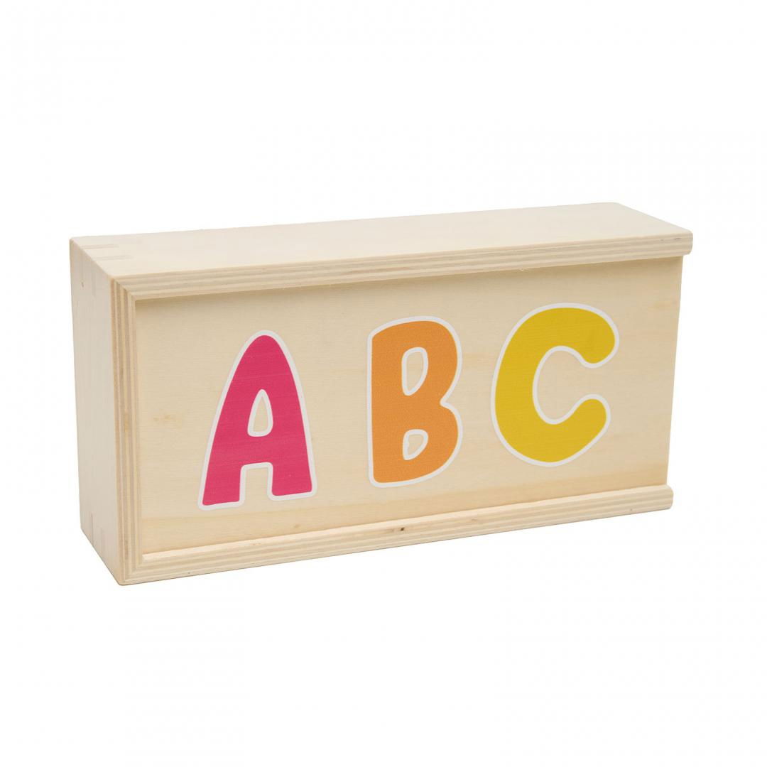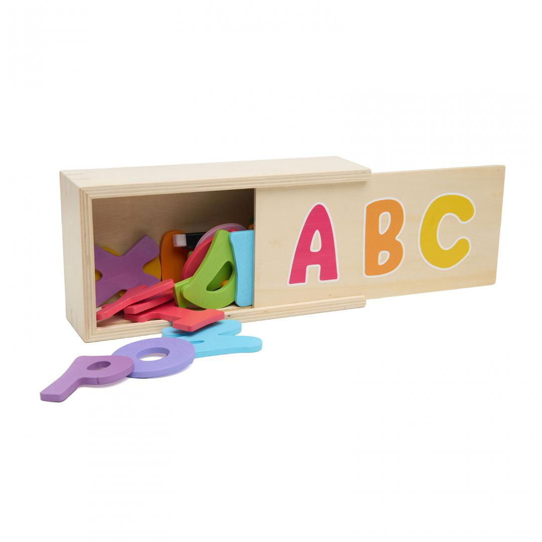 Jocul include 26 de litere din lemn viu colorate, 26 de cartonase asortate, 1 marker ce se sterge si o cutie de depozitare din lemn.
