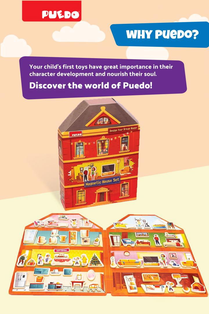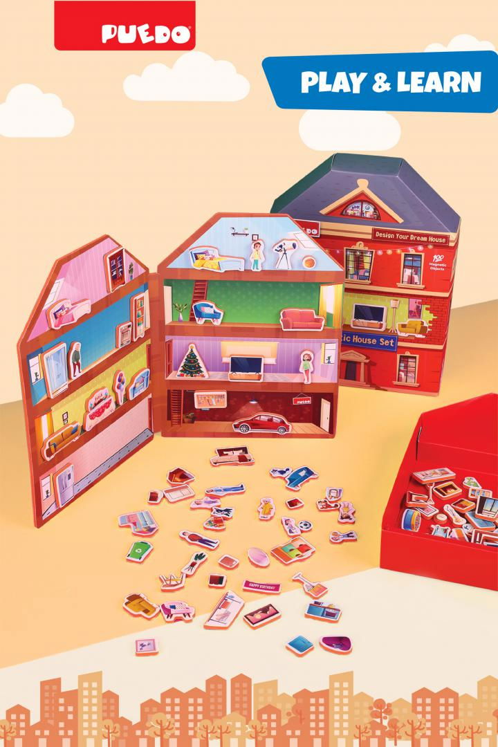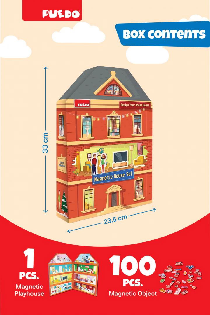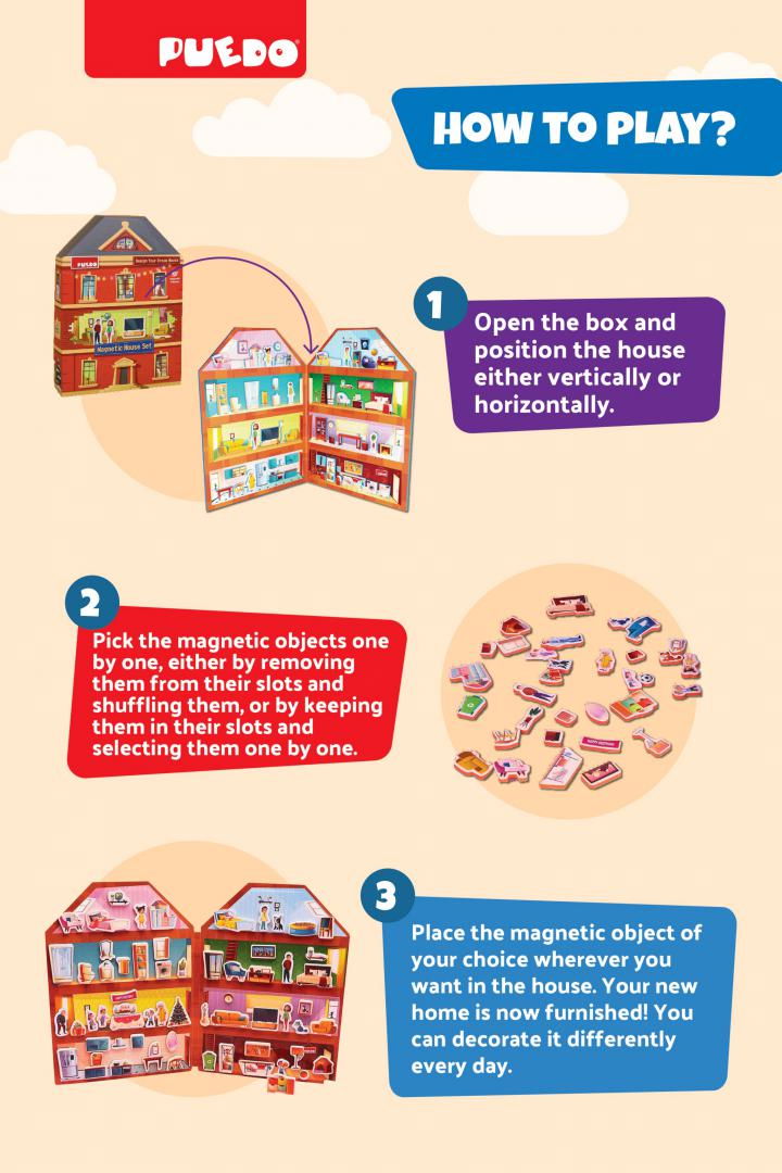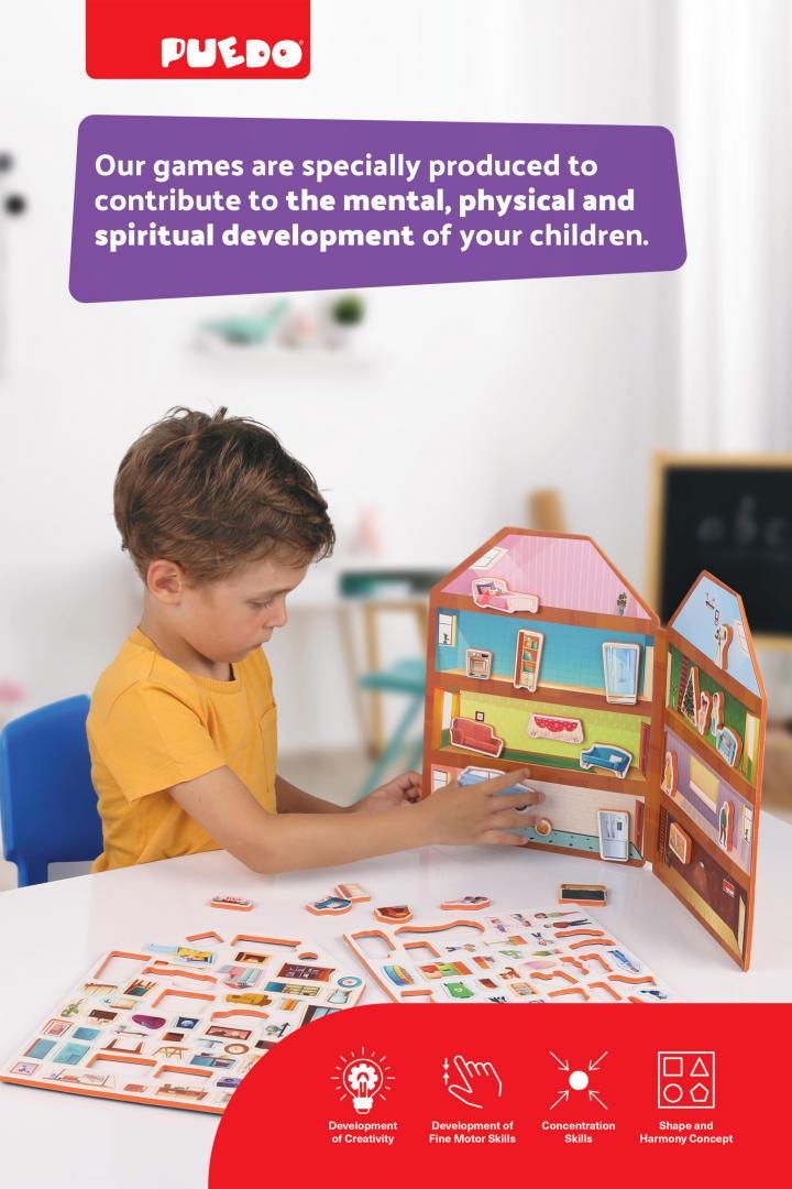 Acesta este un joc magnetic, format dintr-o casa cu 8 camere, special conceputa sub forma unei carti magnetizate din material din spuma si 100 de obiecte diferite de mobilier si obiecte de uz casnic, magnetizate. Imaginatia copiilor va ramane activa ore intregi.n