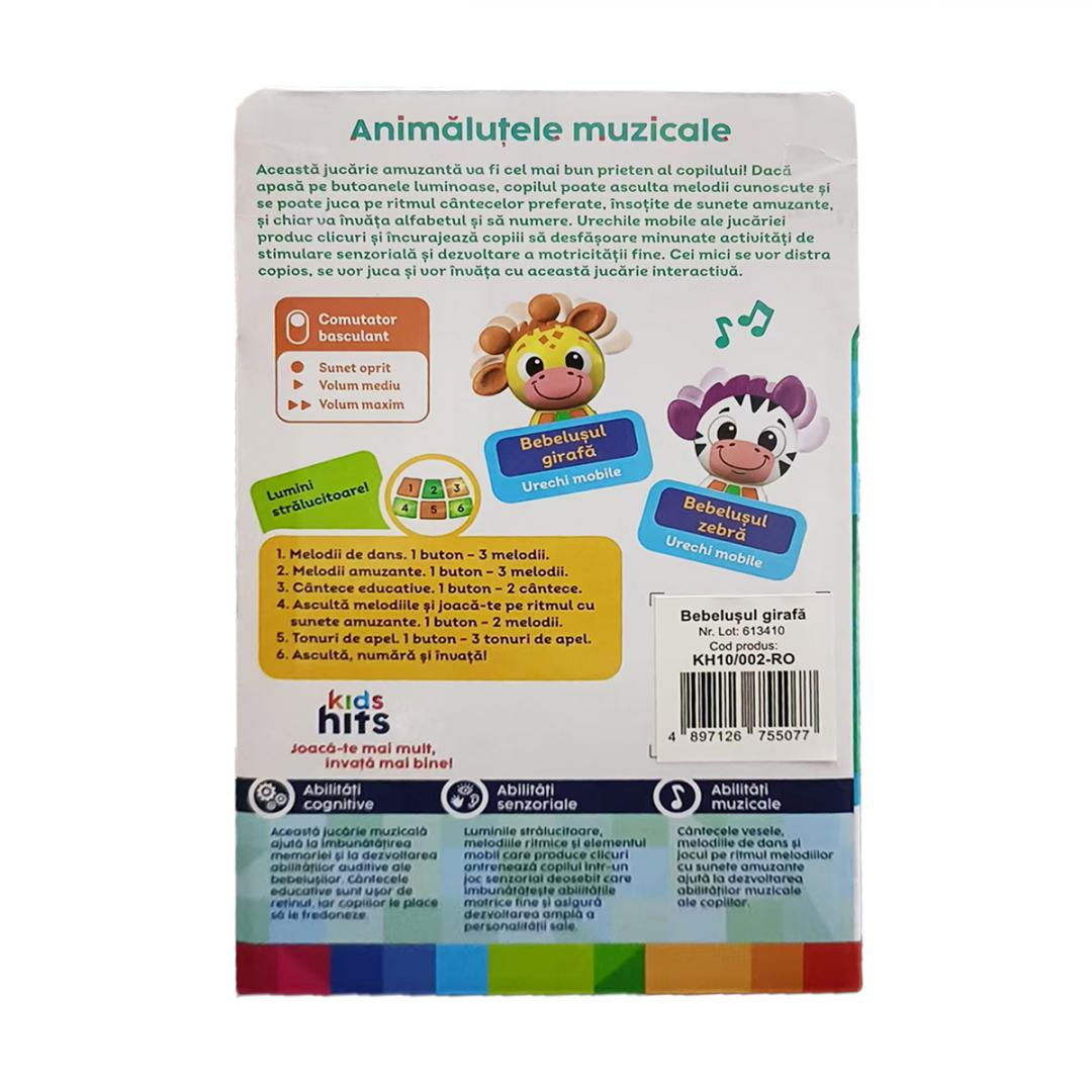 Dacă apasă pe butoanele luminoase, copilul poate ascultă melodii cunoscute și se poate juca pe ritmul cântecelor preferate, însoțite de sunete amuzante, și chiar va învață alfabetul și să numere. Urechile mobile ale jucăriei produc clicuri și încurajează copiii să desfășoare minunate activități de stimulare senzorială și dezvoltare a motricității fine. Cei mici se vor distra copios, se vor juca și vor învață cu această jucărie interactivă.