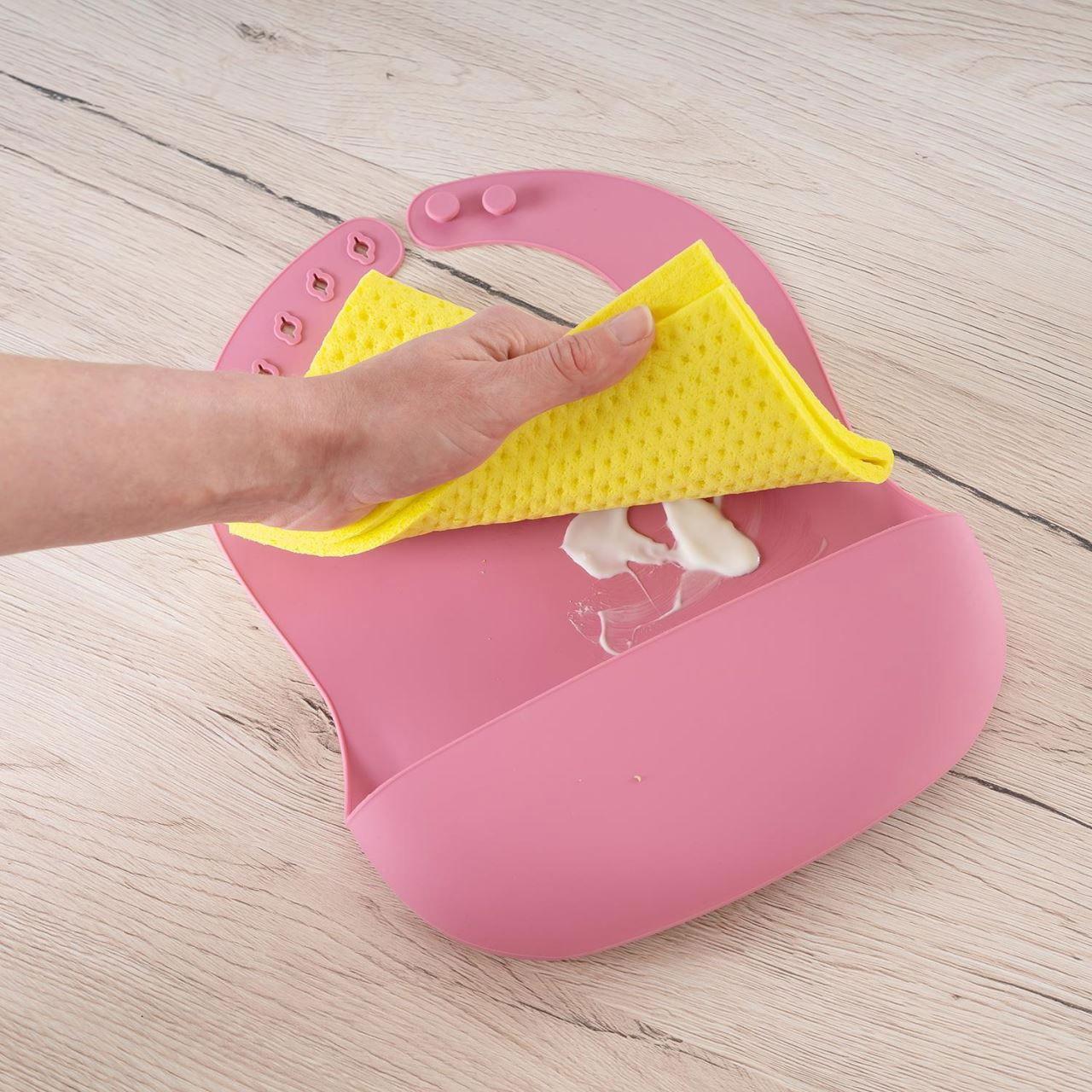 Aceasta bavetica deosebit de dragalasa si moale, este deopotriva robusta si usor de curatat datorita materialului de inalta calitate. Invelisul antiaderent face curatarea extrem de usoara. Spre deosebire de bavetele din material textil, care trebuie intotdeauna spalate in masina de spalat si raman patate sau se deterioreaza in timp, baveta de silicon poate fi curatata cu usurinta de reziduuri sub jet de apa. In cazul murdariei persistente, baveta poate fi curatata in masina de spalat vase fara a se pata.