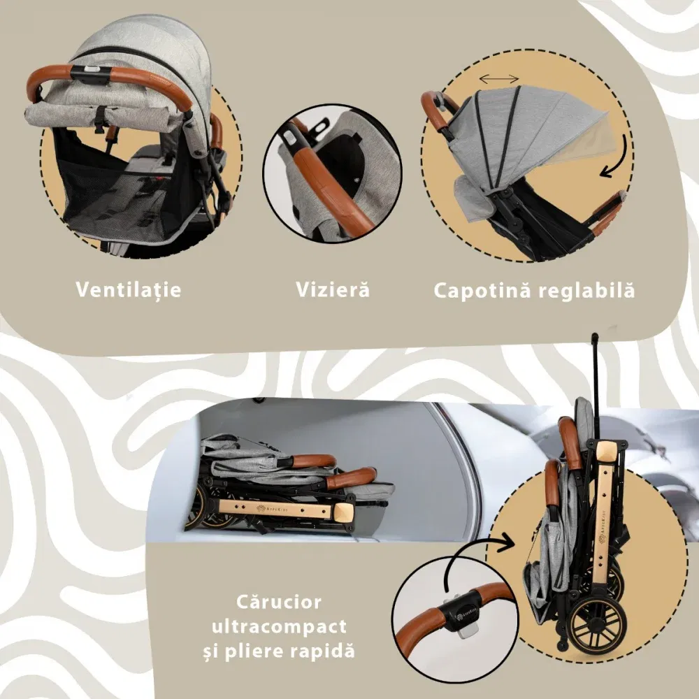 Carucior AppeKids Travel ultracompact, de la 6 luni la 3 ani, cu pliere automata, spatar reglabil, suspensii pe toate rotile si manevrare cu o singura mana. Ideal pentru calatorii si viata urbana. Greutate: 6.7 kg. Standard EN-1888.