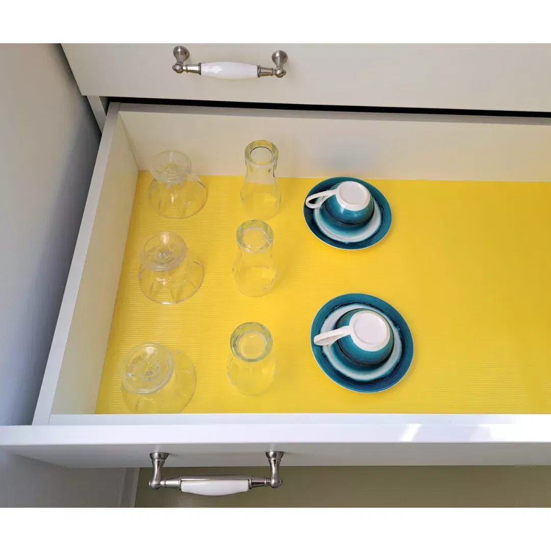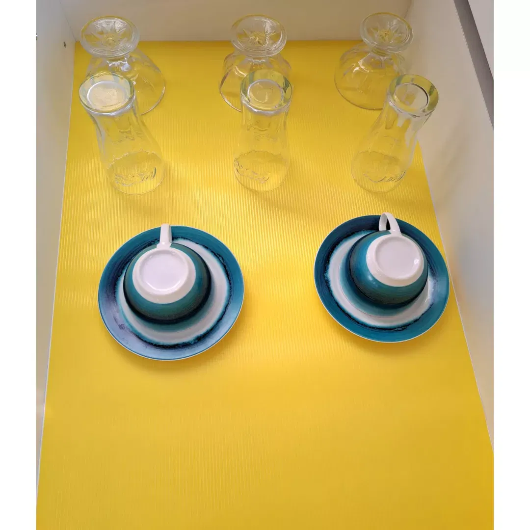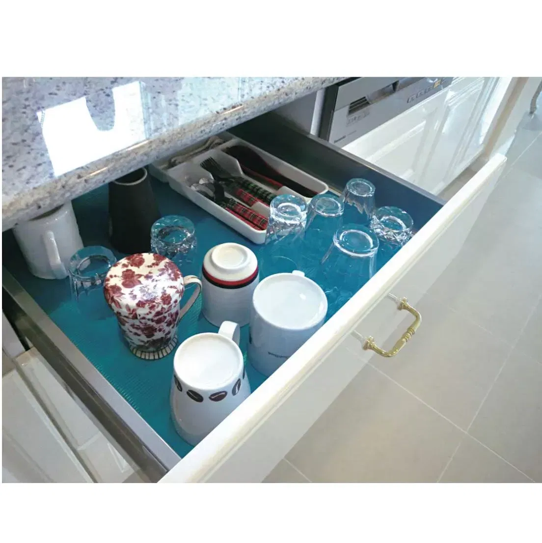 Poate fi utilizată si pe polițe, rafturi, tăvi de servire, uscător pentru vase. Extrem de versatila in casa sau birou.Folia sertare este disponibilă la rolă cu lăţime de 45cm şi o lungime de 150cm.