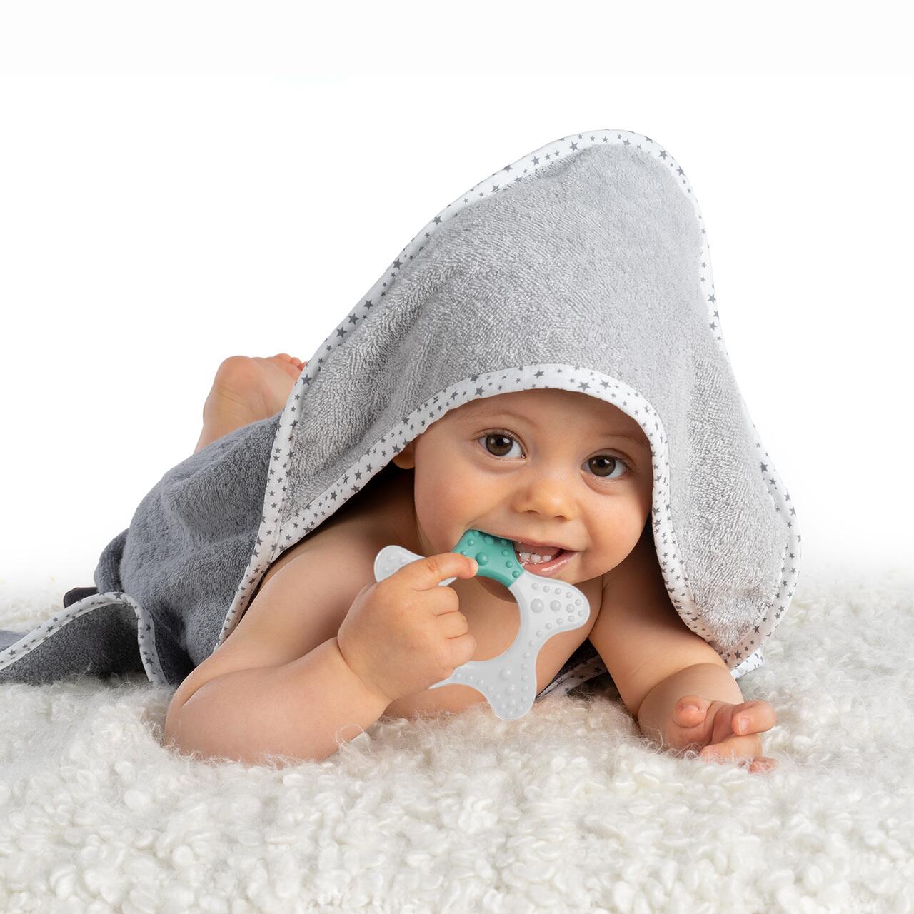Inelul in forma de stea pentru dentitie de la Reer poate fi folosit inca de la varsta de 3 luni. Suprafata sa structurata maseaza usor gingiile, iar varietatea de forme si dimensiuni ofera senzatii diferite de muscat si ros. Greutatea redusa si forma de stea cu o gaura mare in mijloc a inelului de dentitie faciliteaza prinderea de cei mici chiar si cu o singura mana, in timp ce varfurile alungite ajung pana in spate la molari, unde il doare cel mai mult pe copil. In plus inelul de dentitie poate fi atasat convenabil si in siguranta de lanturile de suzete astfel incat sa fie intotdeauna la indemana si sa nu se piarda.