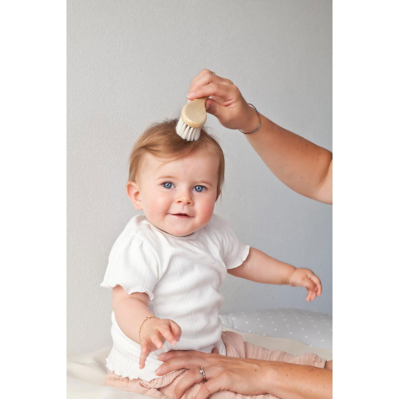 Bebelusii au pielea sensibila, iar materialele naturale sunt cele mai potrivite pentru a intra in contact cu ei. Aceasta perie cu par natural de capra si maner din lemn te ajuta sa ingrijesti cu blandete parul micutului tau. Prin pieptanare, pielea capului este masata usor, curatand totodata si cojitele (numite si crusta de lapte) de pe scalpul bebelusului.