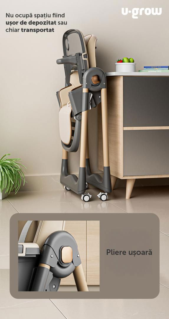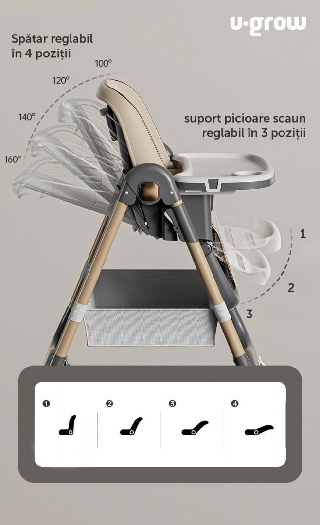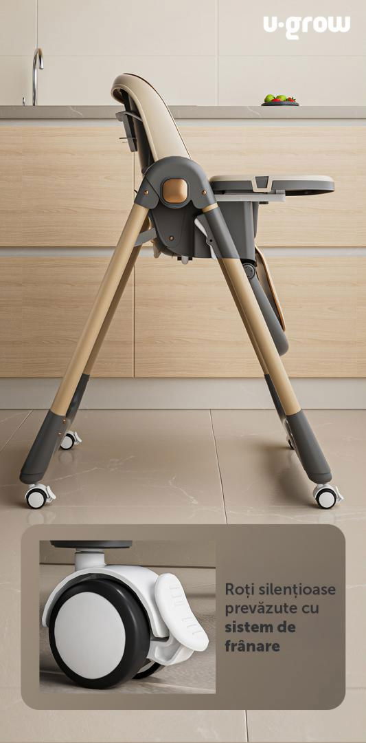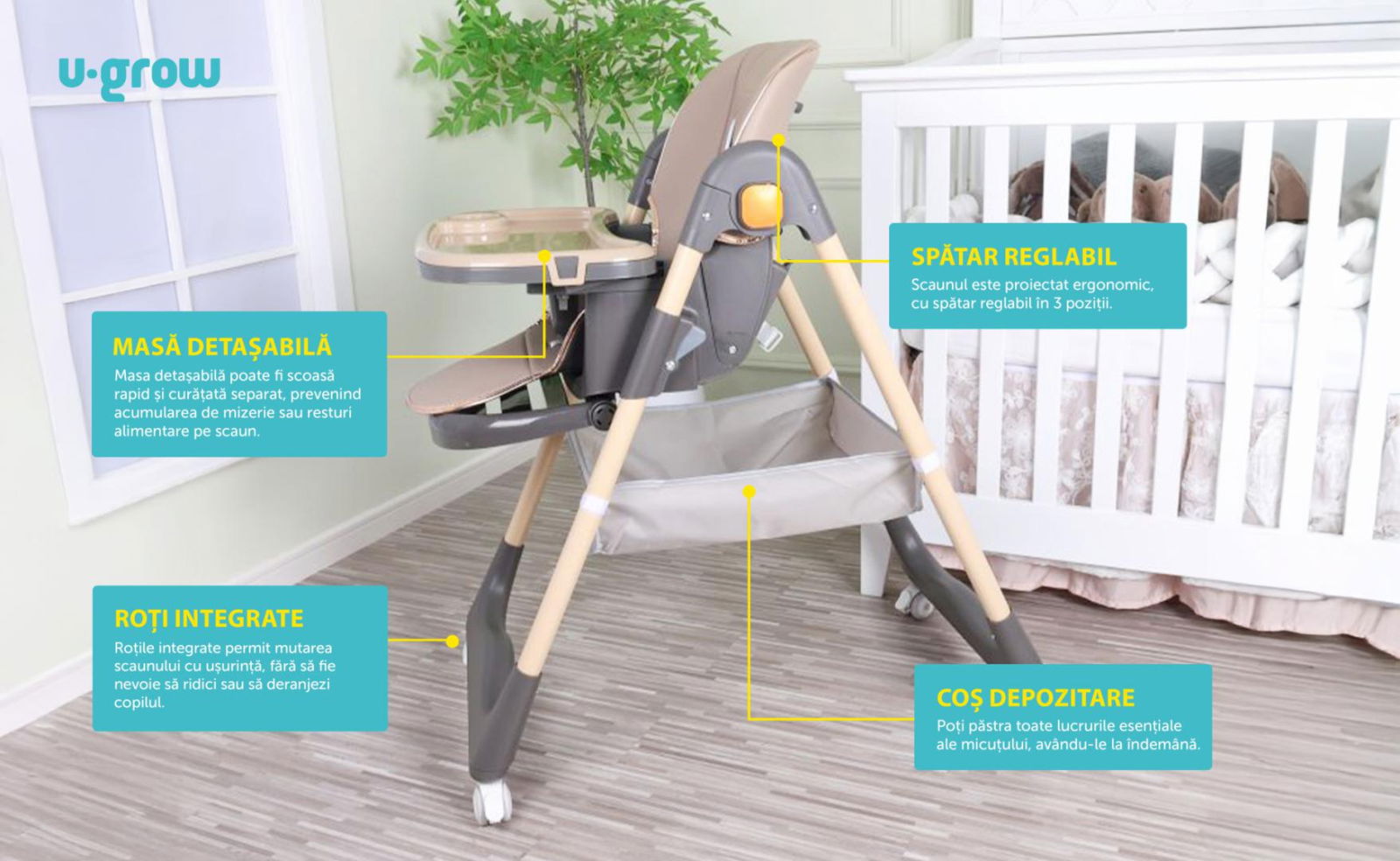 Scaunul de masa U-Grow este o alegere excelenta atunci cand incepe perioada diversificarii alimentare. Datorita unei tapiteriei cu umplutura laterala si a unei perne integrate pentru cap, îi ajuta pe utilizatorii mai mici sa pastreze o pozitie adecvata, sanatoasa si sigura. Deoarece este posibil sa reglati inaltimea si sa inclinati spatarul intr-o pozitie pe jumatate intinsa, scaunul ramane util mult timp – de la 0,5 pana la 4 ani. Scaunul se remarca prin functiile sale practice de mare ajutor in viata de zi cu zi. Este foarte usor de curatat, astfel copiii se vor bucura intotdeauna de un spatiu curat pentru a savura mese si gustari.n