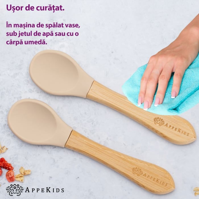 Forma ergonomică este adaptată mâinilor mici, sprijinind dezvoltarea abilităților motorii fine și coordonarea mână-ochi, încurajând totodată hrănirea independentă. Textura moale a vârfului din silicon protejează gingiile și dințișorii sensibili ai copilului, fiind potrivită pentru primele mese solide. Fiind fabricate din materiale naturale, se recomandă spălarea manuală pentru a păstra calitatea lemnului pe termen lung. Acest set este ideal pentru părinții care caută un produs eco-friendly, cu design plăcut și performanță ridicată, realizat cu grijă în România.