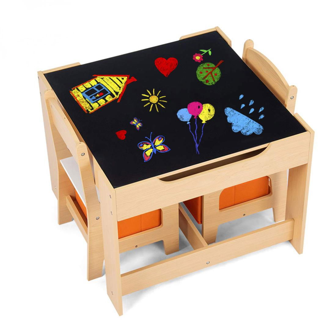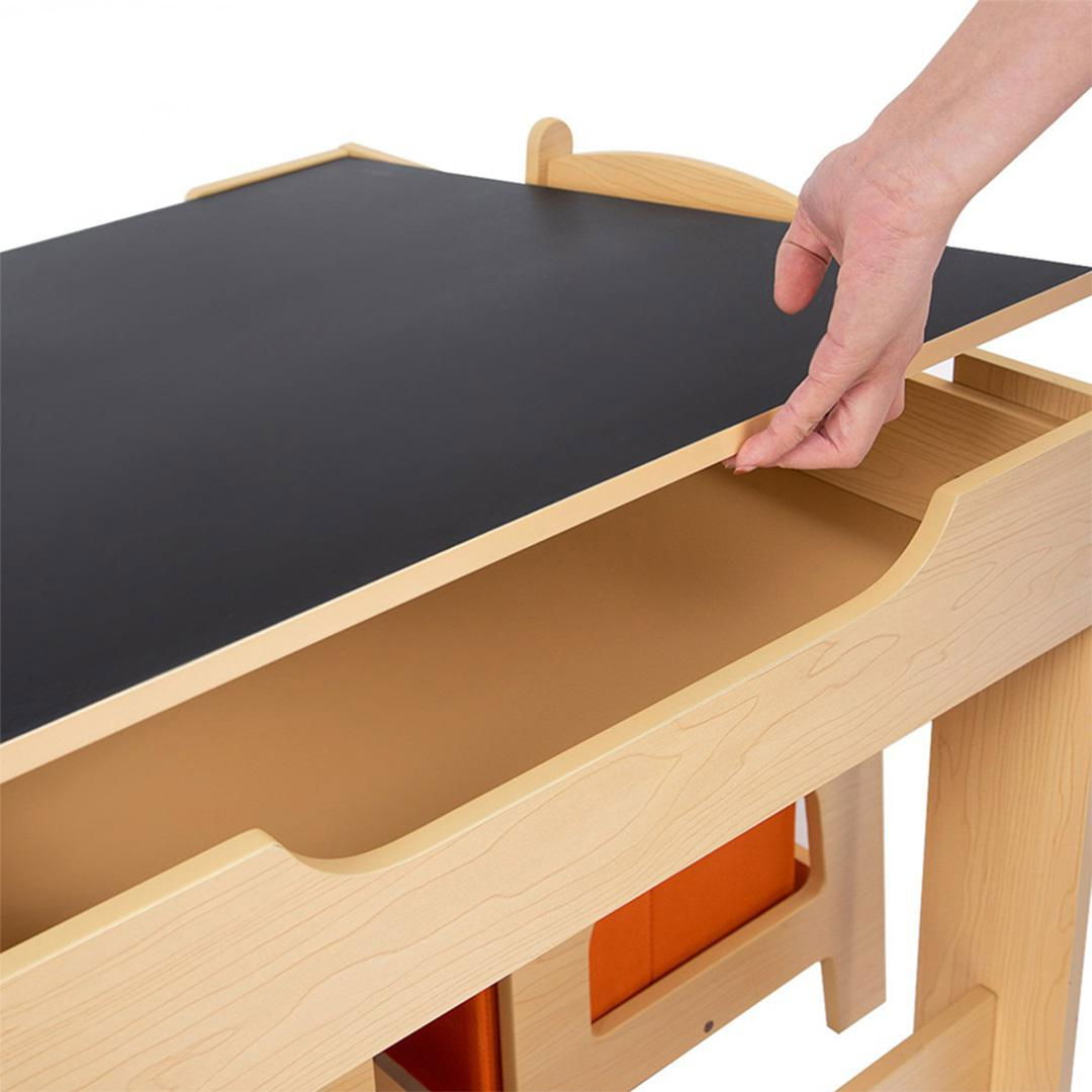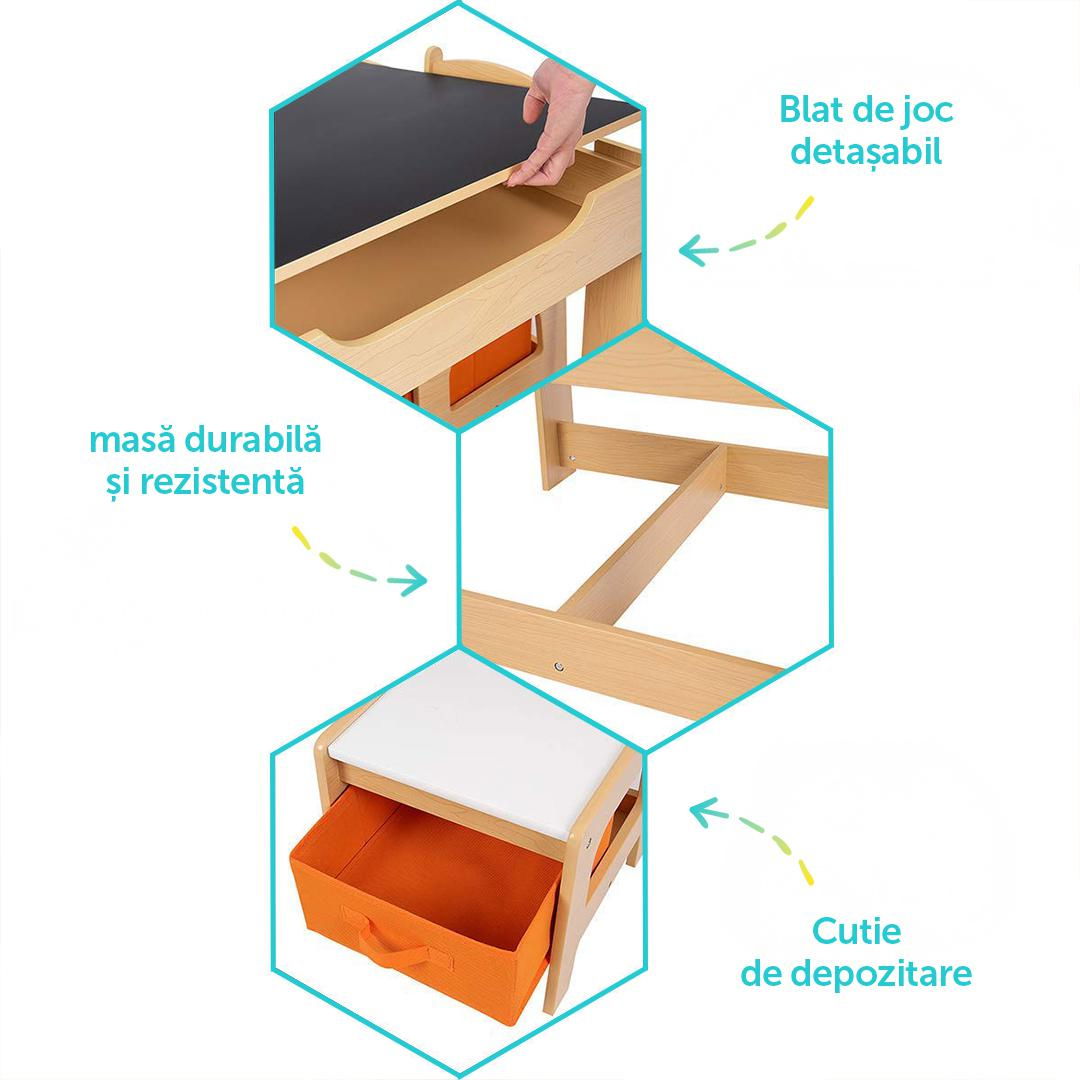 Masă multifuncțională din lemn natural, ideală pentru copiii cu vârsta cuprinsă între 3 și 6 ani. Setul include două scaune și o tăblie reversibilă: o față este tablă de scris cu cretă, iar cealaltă este perfectă pentru diverse activități creative. Masa dispune de un spațiu generos de depozitare sub blat, iar scaunele sunt prevăzute cu cutii de depozitare pentru jucării, rechizite sau alte accesorii. Design robust și funcțional, potrivit pentru joacă și învățare!n