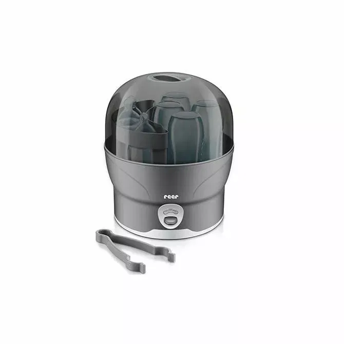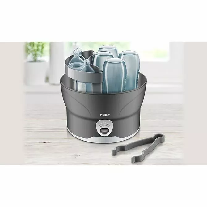 Specificatii: Tip produs: Sterilizator biberoane, cu abur fierbinte, capacitate 6 biberoane, Reer Utilizat pentru: biberoane Caracteristici cheie: oprire automata, cos pentru sticle si tava detasabila pentru accesorii: suzete, tetine, inele de dentitie, lingurite sterilizare rapida si cu economie de energie in