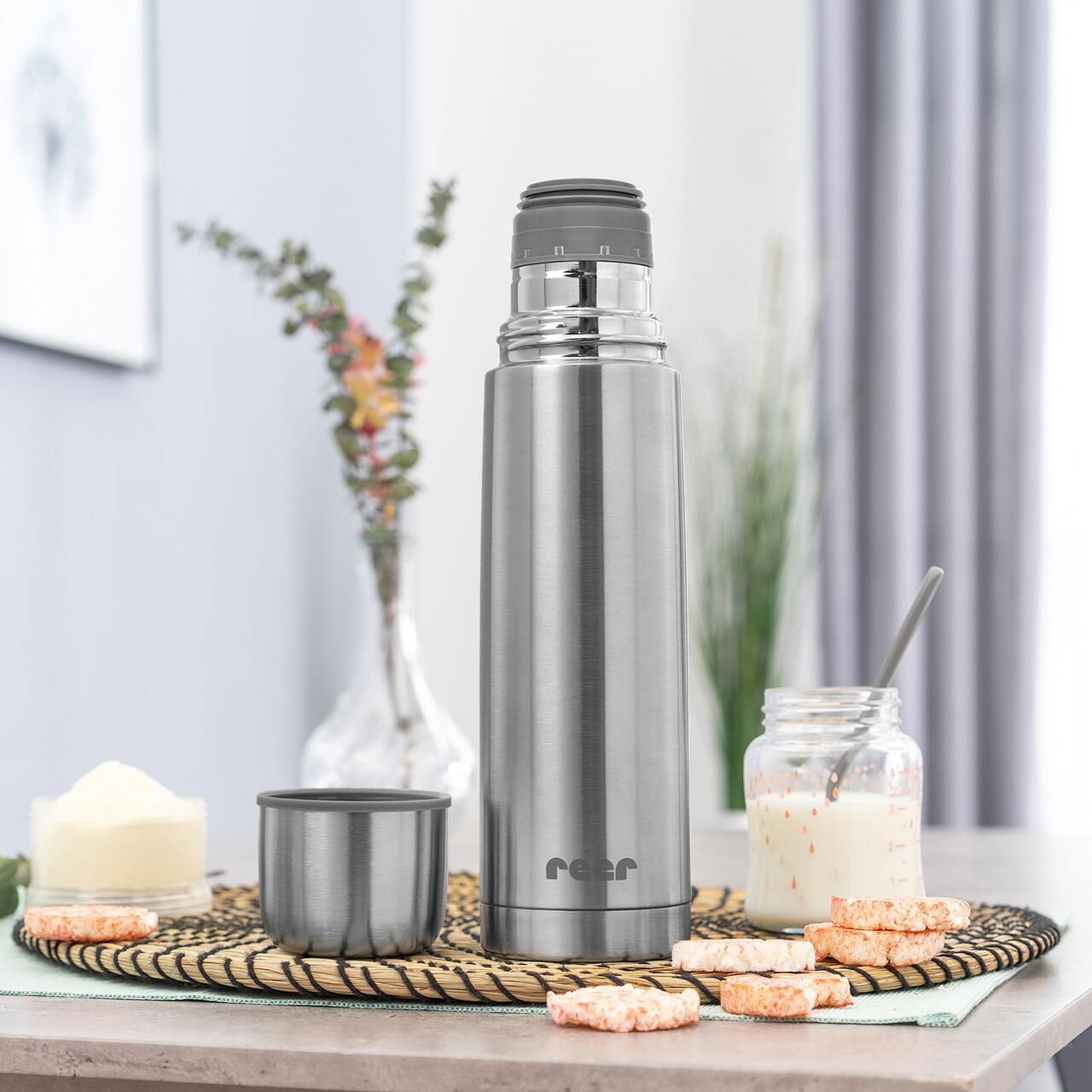 Cand cei mici sunt infometati trebuie sa actionati rapid. Alaturi de formula de lapte si un biberon, este nevoie de un lucru mai presus de toate: apa la temperatura perfecta. Termosul Pure de la Reer este ideal pentru prepararea usoara a formulelor de lapte pentru ca mentine calda apa fiarta pana la 24 de ore. Indiferent daca tu si bebelusul tau sunteti la plimbare sau daca sunteti noaptea in bucatarie, termosul Pure mentine apa calda ore intregi, permitandu-ti sa prepari rapid formula fara griji. Corpul termosului este realizat cu pereti dubli, avand interiorul vidat. Datorita dublei izolari, exteriorul sticlei nu se incalzeste niciodata atunci cand este umplut cu apa fierbinte, protejand astfel impotriva arsurilor.