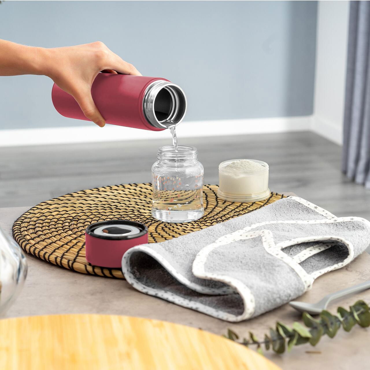 Usor de manevrat datorita unei deschideri largi de 5 cm, ce permite chiar adaugarea de bucati de legume sau fructe proaspete pentru a obtine o bautura delicioasa de vara. Datorita materialelor de calitate, termosul nu are miros si, desigur, nu are BPA, ftalati, PVC sau plastifianti nocivi.