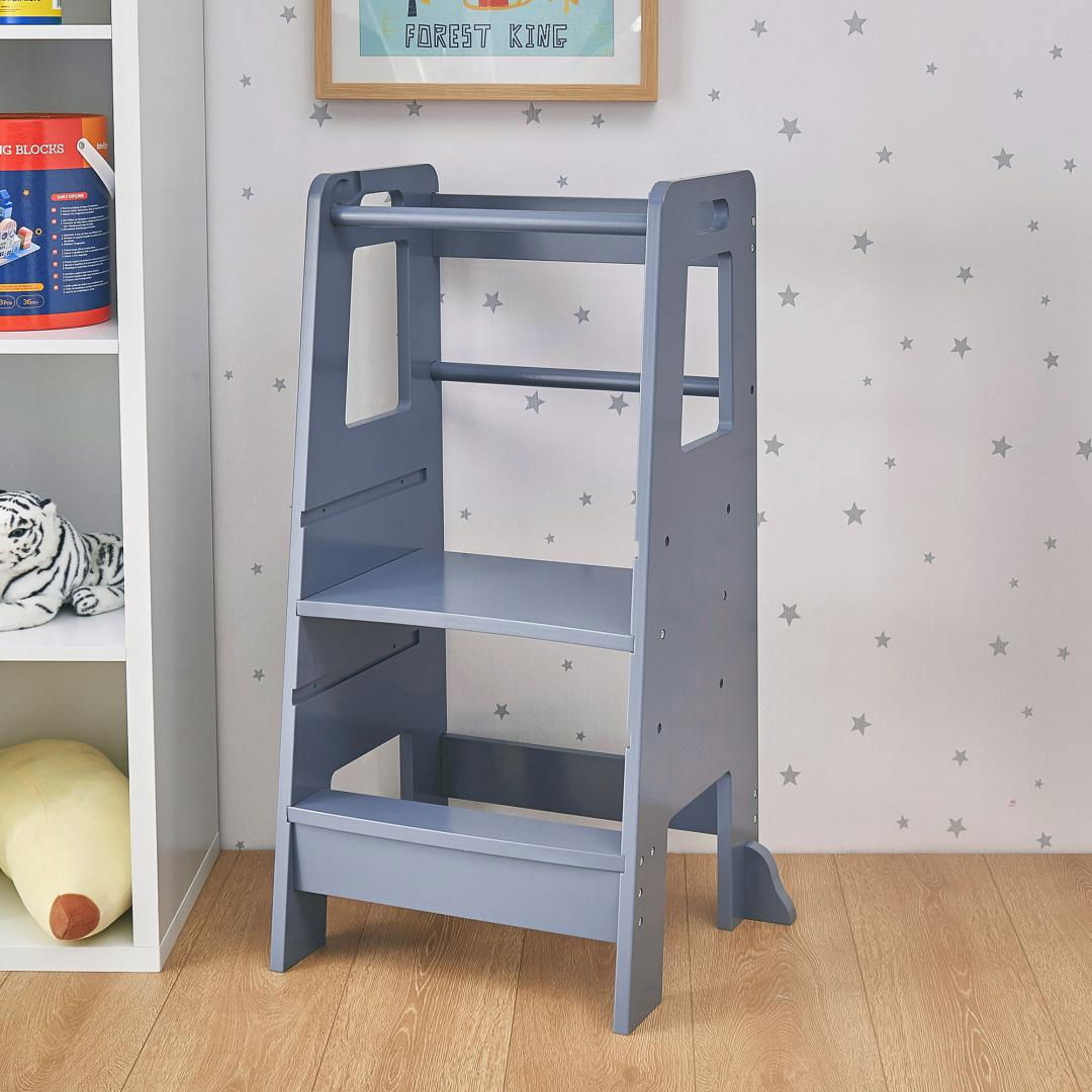PLATFORME REGLABILE - inaltimea platformei pe care sta copilul poate fi reglata, ajustand-o la inaltimea copilului si inaltimea blatului de bucatarie. Prima treapta are o inaltime de 19 cm de la sol. Cea de a doua treapta se poate regla la inaltimi diferite in functie de varsta si inaltimea copilului si anume : 32.5cm, 42.5cm, 52.5cm (inaltimea treptei de la sol)