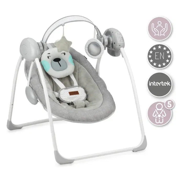 Leagăn MoMi LISS Bear cu 5 viteze de balansare, cronometru, 8 melodii și 2 jucării interactive. Sigur, compact, alimentat cu baterii, ideal pentru bebeluși de la naștere.