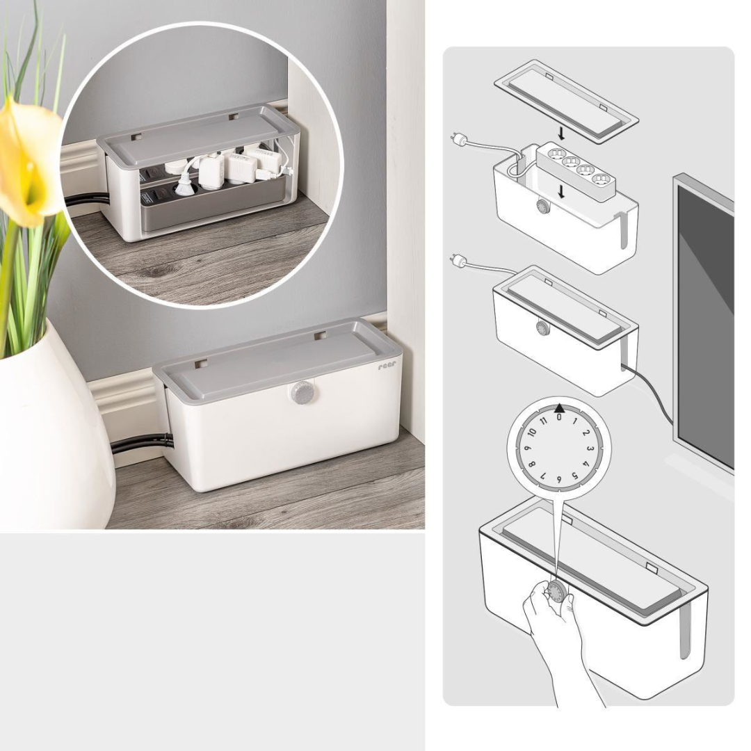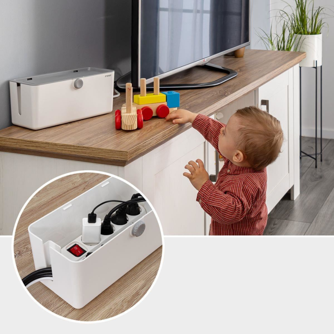 Cand bebelusii incep sa mearga de-a busilea si sa invete sa mearga in picioare, nu poti feri nimic de curiozitatea lor si de dorinta de a descoperi totul. Prin urmare, ca parinte, te straduisti sa creezi un mediu sigur pentru ei si sa minimalizezi sursele de pericol. Accidentele electrice sunt deosebit de periculoase, asa ca sursele de curent trebuie asigurate in mod eficient. Cutia de cabluri CableGuard de la Reer creeaza ordine si ascunde eficient si estestic stecherele si firele din calea copiilor.