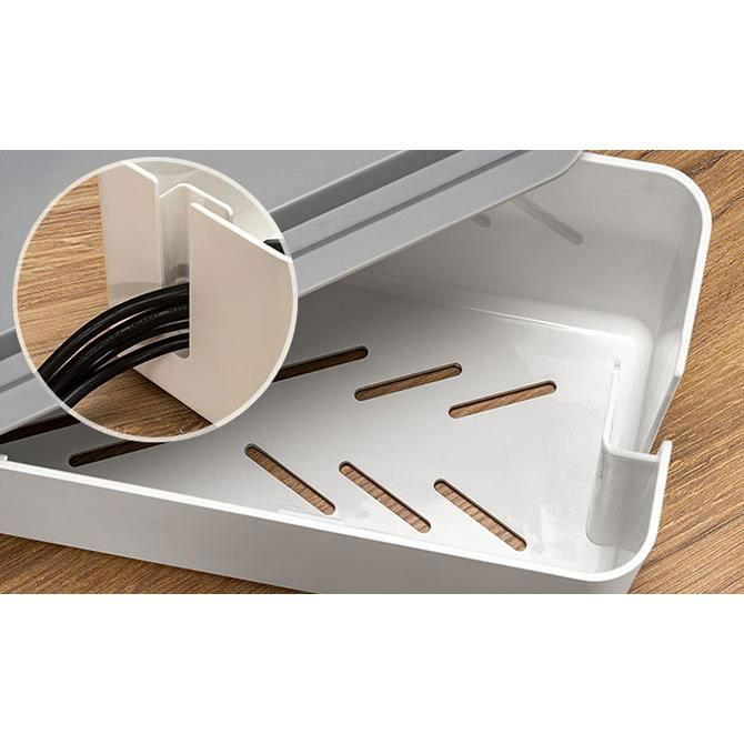 Cutia de cabluri organizeaza usor orice tip de cabluri si stechere, cu o dimensiune generoasa de 30,5 x 13,5 x 13,5 cm. Este foarte utila pentru a ordona cablurile de pe sau de sub biroul tau aglomerat, precum si oriunde altundeva se aduna multe cabluri. Este potrivita pentru prelungitoare cu 3 si 4 prize cu comutatoare, temporizatoare sau incarcatoare. Trecerile pentru cablu din capac faciliteaza incarcarea telefoanelor mobile si a tabletelor, fara a fi nevoie sa cauti cablul de incarcare respectiv.