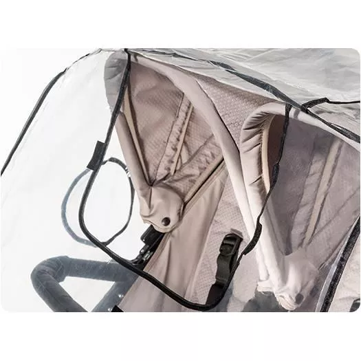 Daca sunteti surprinsi de ploaie, zapada sau vant puternic, puteti sa instalati si sa indepartati rapid protectia de ploaie cu ajutorul benzilor cu arici si a carligelor de ancorare. În felul acesta, micii pasageri raman uscati si protejati.