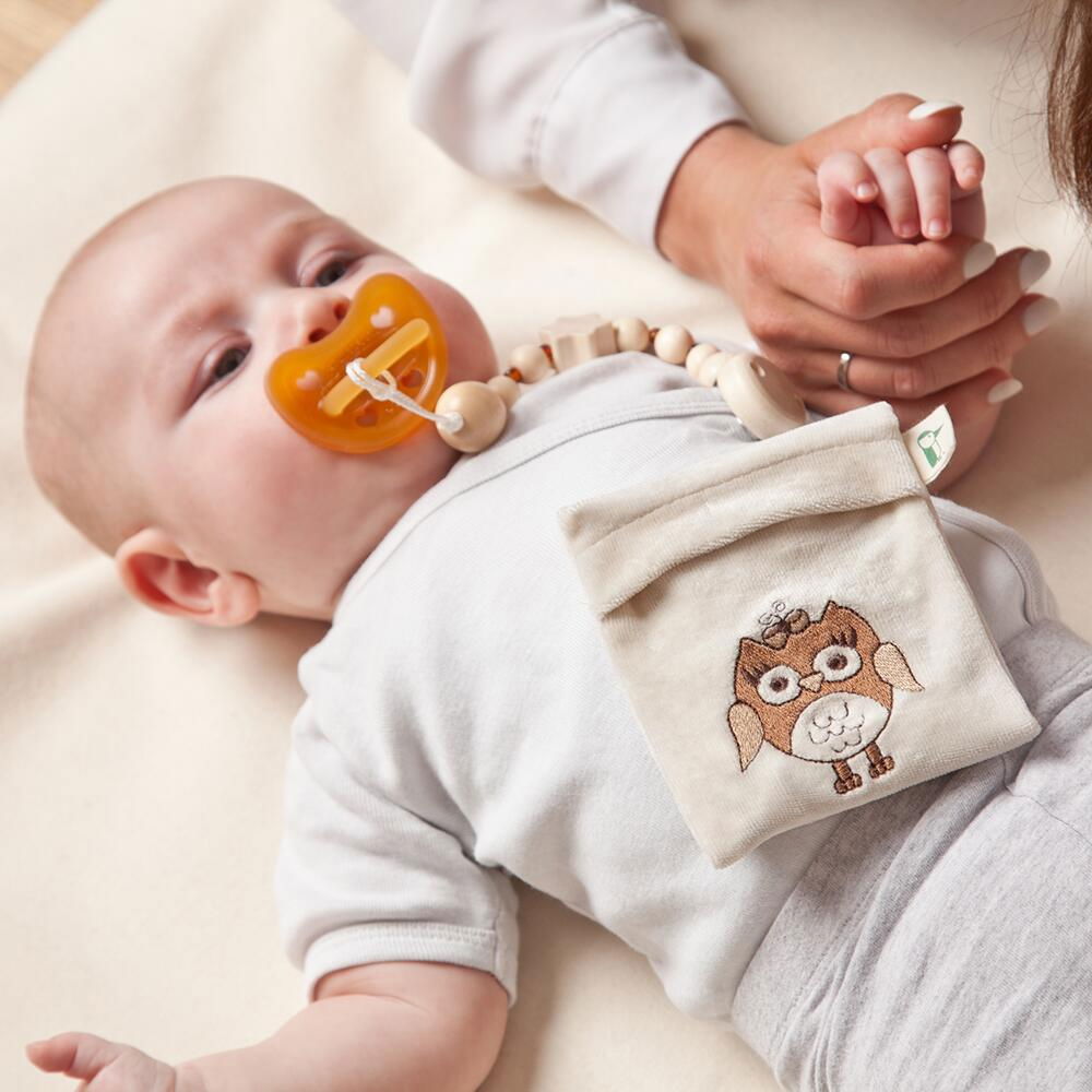 - Proprietati: tetina cu forma ortodontica prietenoasa cu maxilarul; scut moale in forma de inima ce ofera libertate de miscare; orificii de ventilatie pentru a impiedica iritarea pielii,