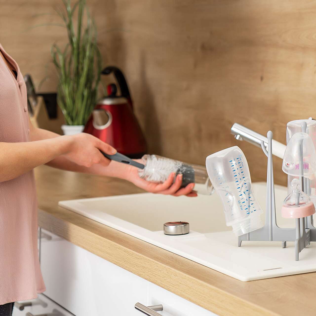 O curatare completa nu include doar curatarea biberonului, ci si a tetinelor, a capacelor sau a suzetelor si a inelelor de dentitie. Prin urmare, suportii pentru sticle au fost echipati suplimentar cu brate de prindere laterale. Suzetele cu inele de prindere sau tetinele pot fi pur si simplu atarnate aici. Sunt potrivite chiar si pentru uscarea accesoriilor sau tuburilor pentru pompa de san.