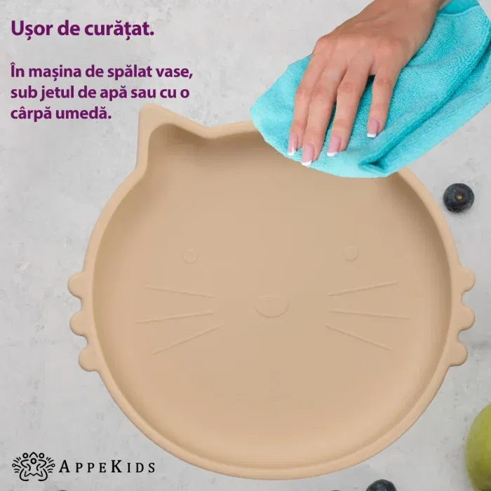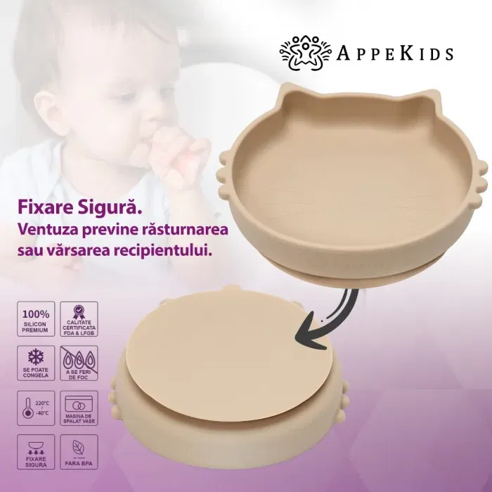 Bol silicon cu ventuză AppeKids Kitty II, fără BPA, 100% non-toxic. Ideal pentru diversificare bebeluși 6 luni+, rezistent la temperaturi ridicate, ușor de curățat.