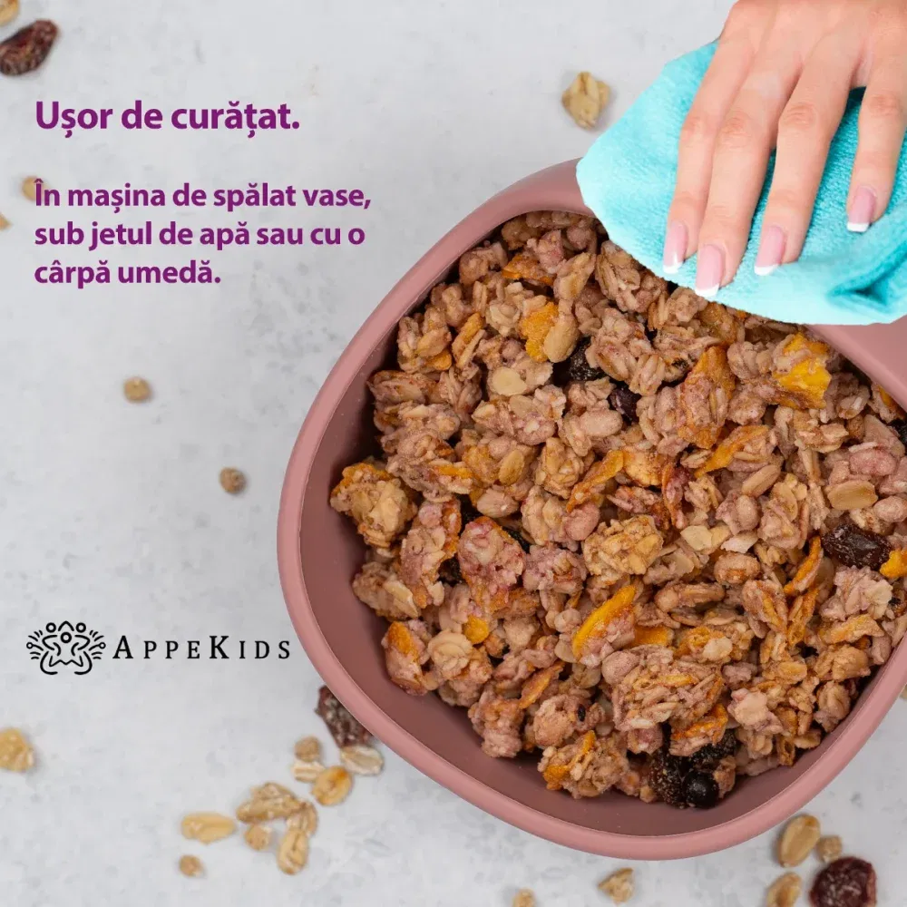 Bolul din silicon cu ventuză AppeKids Classic este un accesoriu esențial pentru diversificarea alimentației bebelușilor. Fabricat din silicon alimentar de calitate superioară, certificat FDA și LFGB, acest bol nu conține BPA, ftalați, peroxizi, plastic sau metale grele. Produsele AppeKids sunt testate în unități independente de renume mondial și respectă standardele europene privind siguranța chimică și fizică.