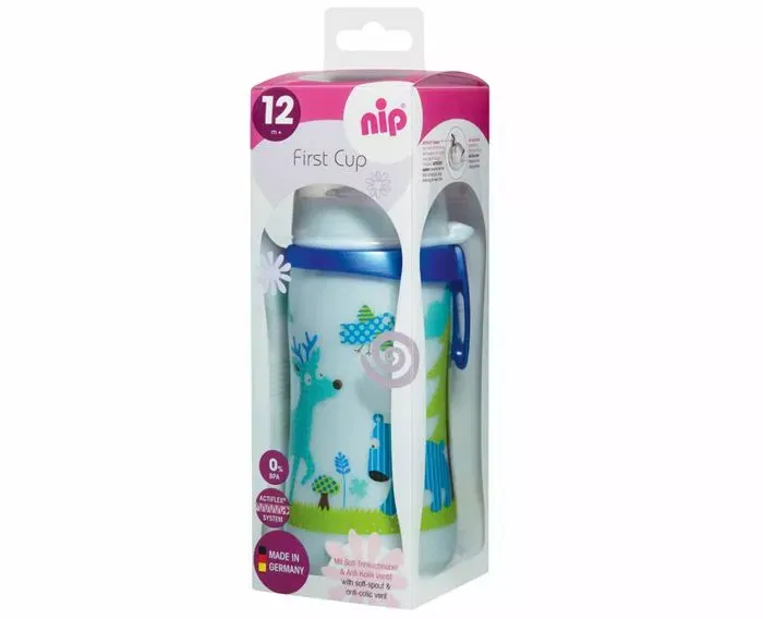 Cana de baut antivarsare pentru bebelusi nip First Cup din PP 330 ml, cu clip de prindere si adaptor de baut din silicon moale, ventilat cu ACTIFLEX, de la 12 luni.